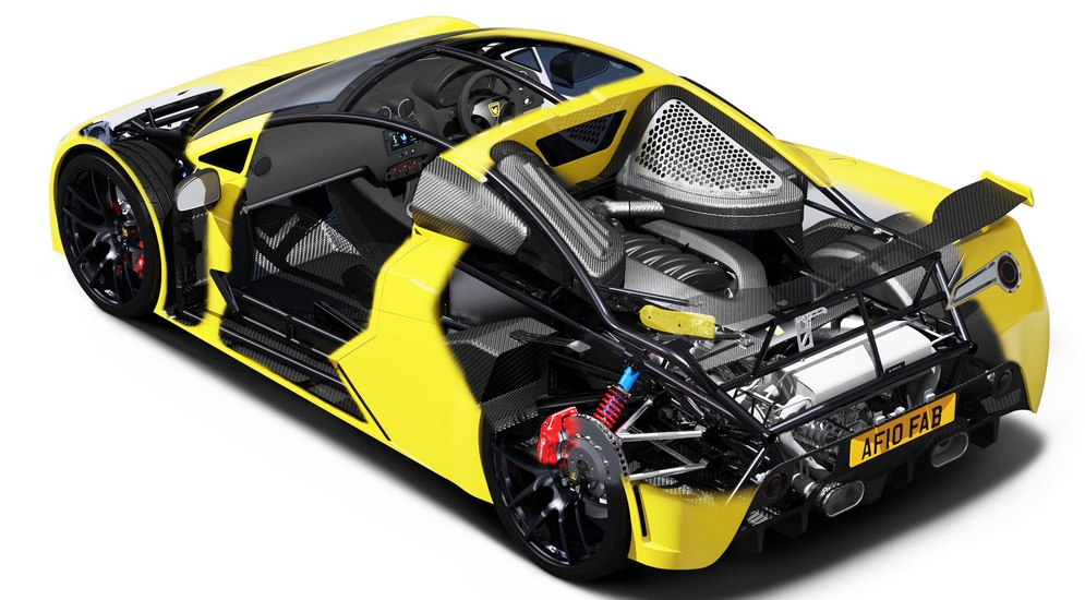В салоне – обитые кожей сиденья и панели из углепластика, а также мультимедийная система и двухзонный климат-контроль. «Бюджетный» суперкар стоит всего 275 тысяч евро, а это почти в четыре раза меньше полностью углепластикового AF10.