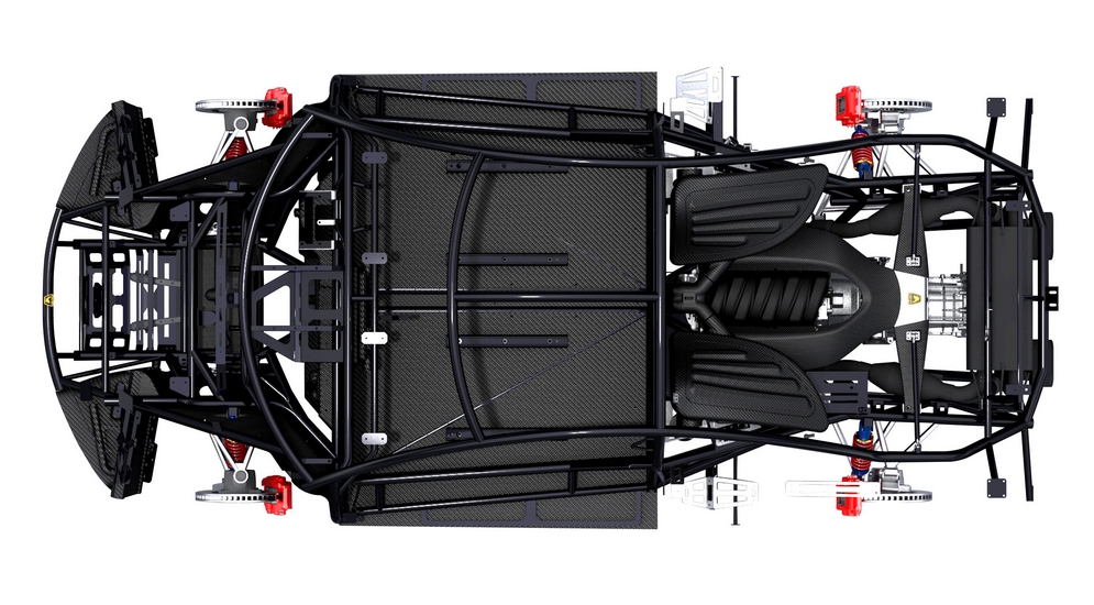 В основе среднемоторного болида оказалась трубчатая пространственная рама, сваренная из стальных труб, на которой закрепили внешние панели кузова, выполненные из углепластика и кевлара, что позволило оставить массу автомобиля на уровне 800 кг. К раме крепились и алюминиевые рычаги независимых подвесок передних и задних колес, которые для улучшения управляемости имели еще и дополнительную толкающую штангу типа «push-rod».