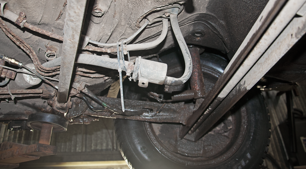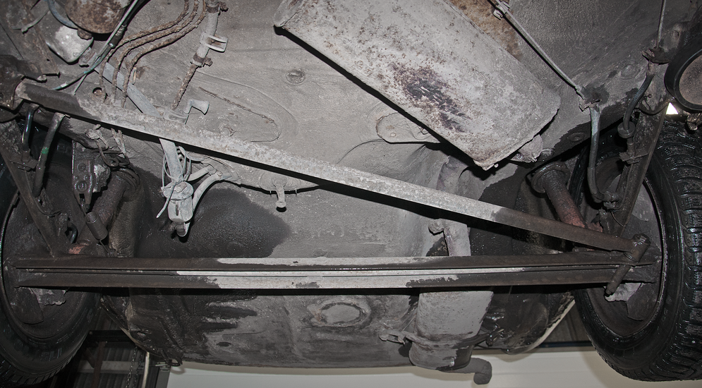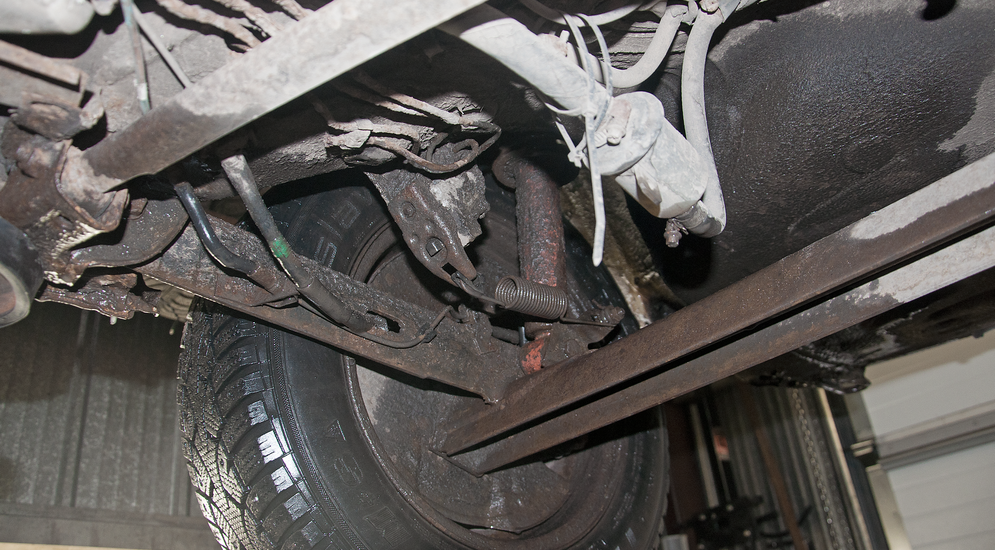 В основе задней подвески лежит Г-образный профиль с трубчатым торсионом внутри. «Фишка» подвески – тяга Панара, поперечная штанга, прикреплённая одной стороной к кузову, другой – к подвеске. Функция этой тяги – боковой упор балки. У этой конструкции есть один недостаток: в ненагруженном состоянии или со значительной перегрузкой балка смещается чуть вправо, и только со средней загрузкой всё стоит ровно. Кому-то эта конструкция не нравится, поэтому в жизни владельца начинается период бурного «колхозинга». Самое распространённый «тюнинг» – это разрезанная тяга, в которую вварен механизм для регулировки её длины. Механизм собирают из подручных средств, хорошо для этих целей подходят ВАЗовские наконечники рулевых тяг: они по своей природе задуманы для того, чтобы менять длину тяги, а ВАЗовские – потому что дешёвые. На нашей машине тяга стоит родная, сварки не видавшая, и даже на приличных сайлентблоках.