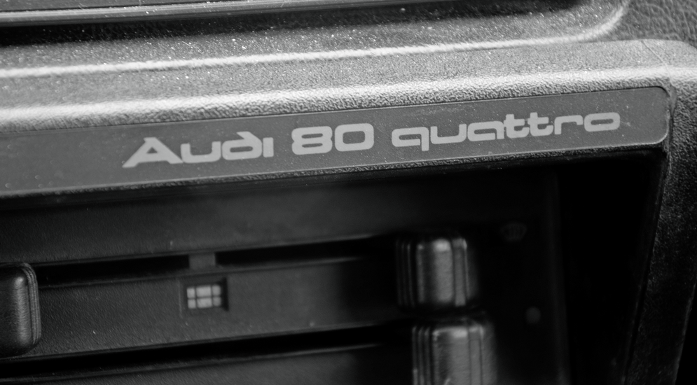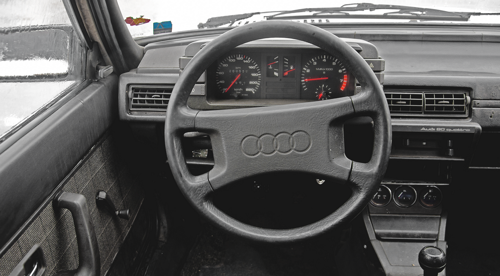 Салон, к сожалению, от идеала далёк. На панели красуется шильдик «Audi 80 Quattro». Так как в этой машине полного привода отроду не водилось, то вывод очевиден – панель уже меняли. Дизайном она удивить не может, разве что небывалом количеством углов, но так было принято в дизайне 80-х. Но давайте сядем за руль и рассмотрим панель чуть подробнее.