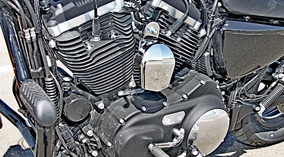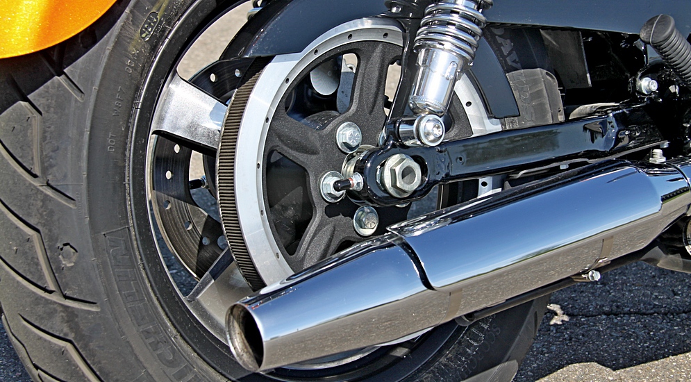 Так, «спортстеровский» двигатель – это, разумеется, V-образная «двойка» воздушного охлаждения. Совершенно типичная компоновка для Harley в целом. Однако, в отличие от «больших» Harley, коробка передач располагается не в отдельном картере и приводится от двигателя ремнем, а выполнена по более привычной для современных мотоциклов схеме, в едином картере с двигателем. Привод главной передачи же традиционен для H-D – ремнем.
