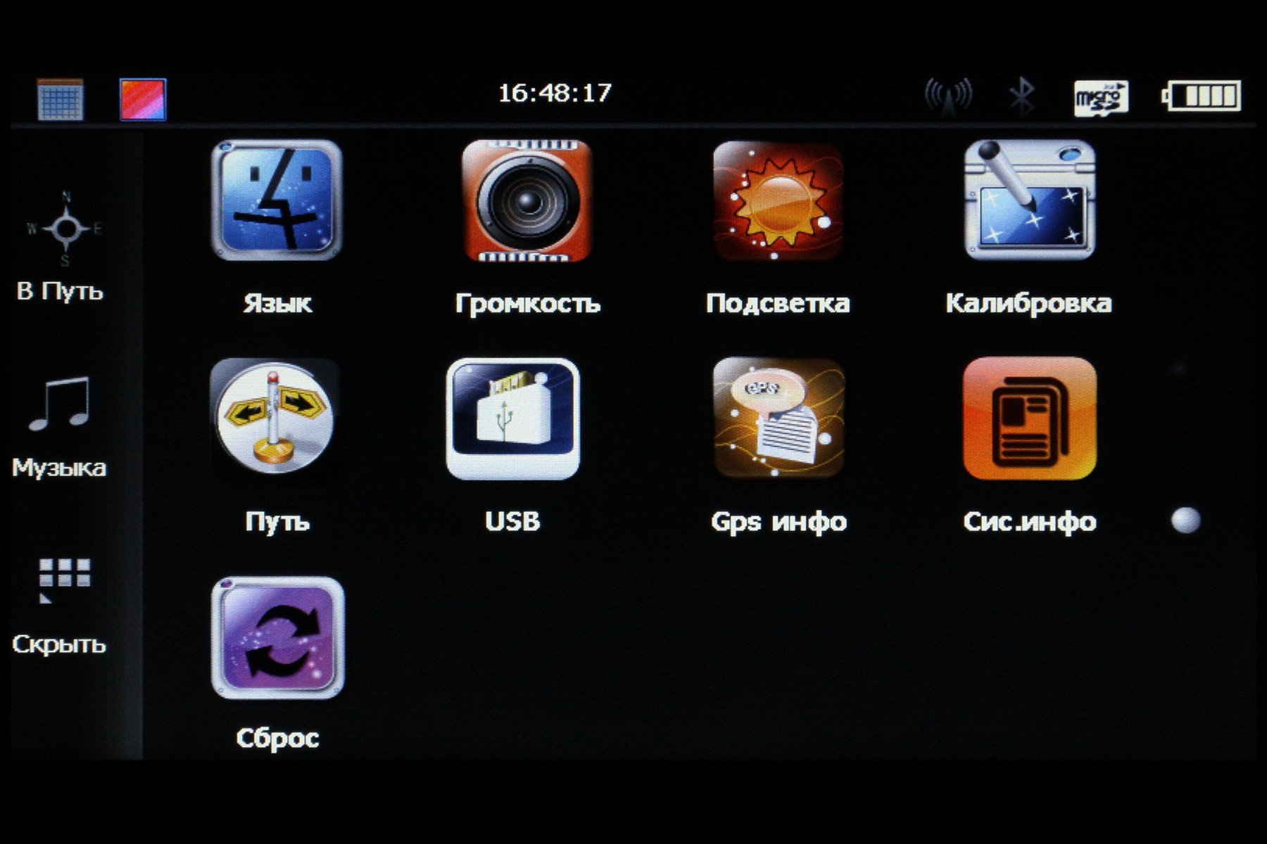 Включаем. Главное меню прибора организовано по принципу матрицы иконок и состоит из двух экранов, которые прокручиваются скользящим движение пальца сверху вниз и наоборот. Принцип построения меню здесь идентичен тому, что был применен в другой модели компании – ТМ-650. Здесь разработчики также «вытащили» все пункты меню второго уровня «наверх», разместив их на главном уровне. Решение, на мой взгляд, удачное. Иконки все разноплановые и разноцветные, хорошо прорисованы, что в сумме эстетически выглядит просто на отлично.