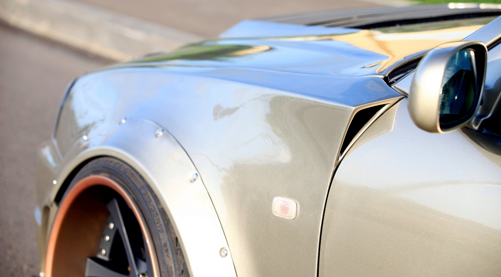 Потом был куплен оригинальный обвес Uras. Но, собрав с ним машину, владелец все равно понял, что его не устраивает узкая задняя часть автомобиля, очень длинная, как крокодил. Так что он продал этот обвес и купил во Владивостоке комплект Sedan GT-R Look. В него входили: передний бампер, губа на бампер, реснички на фары, передние крылья, капот, пороги, накладки на пороги, заднее расширение крыльев, задний бампер и накладки на задний бампер. По приходу набора стало ясно, что расширения явно мало: раскатанные задние крылья «Скайлайна» уже были шире, чем купленное расширение!