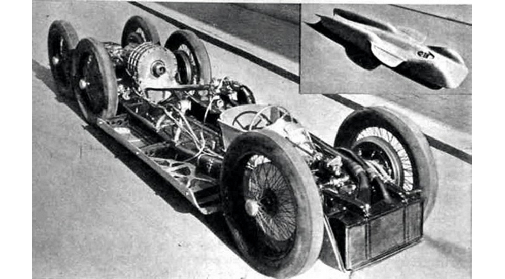 Казалось, этот факт должен был поставить на дерзком проекте точку, ведь при таком весе нагрузка на задние колеса оказалась бы просто чудовищной. Сверхскоростные гоночные шины могли не выдержать, а любая поломка шасси на такой скорости оборачивалась гибелью для пилота. Но капитан Эйстон идти на попятную не пожелал. Тогда Андро озвучил свой сумасбродный план по внедрению в конструкцию третьей оси. Причем все три пары колес должны были иметь разную колею и действовать по схеме 6х2 (шесть колес, два ведущих). Средняя ось в такой конструкции, как и передняя, была управляемой, и несла бы на себе сдвоенные шины. Идея с покрышками оказалась заимствована у марки легендарных болидов Bluebird, на которых давний соперник Эйстона, Малкольм Кэмпбелл, установил серию мировых рекордов. Кстати, именно он предложил использовать высохшее соленое озеро Бонневиль (штат Юта) в качестве идеального полигона для соревнований в скорости.