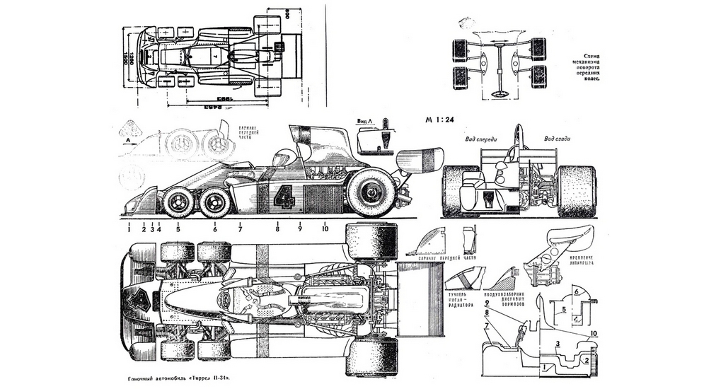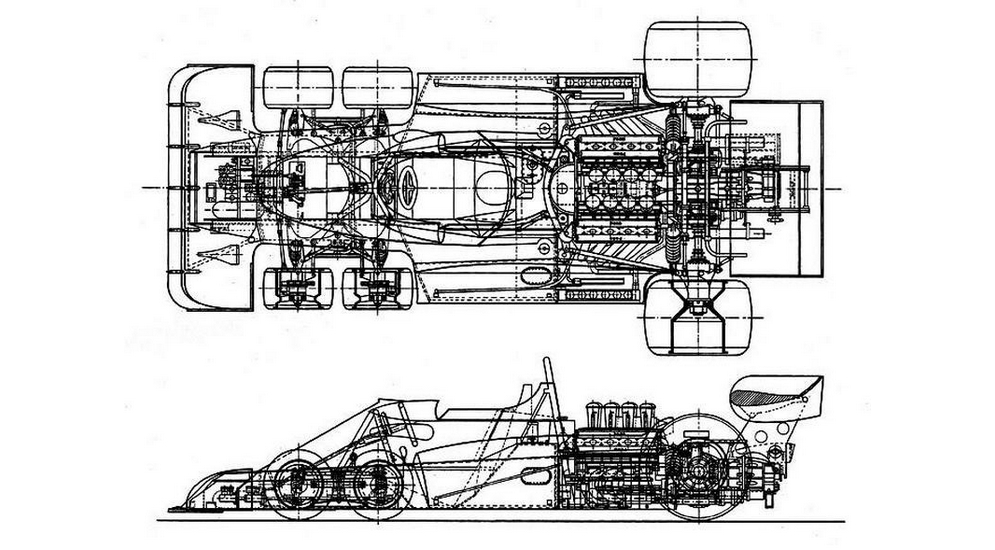 Чертежи и наброски «шестипалого» болида. На его презентации в 1975-ом в Лондоне журналисты не поверили своим глазам, решив, что перед ними не ездовая реплика, сделанная для рекламы масел Elf. Но скорые достижения Р34 Tyrell на треках развеяли сомнения даже злостных скептиков.