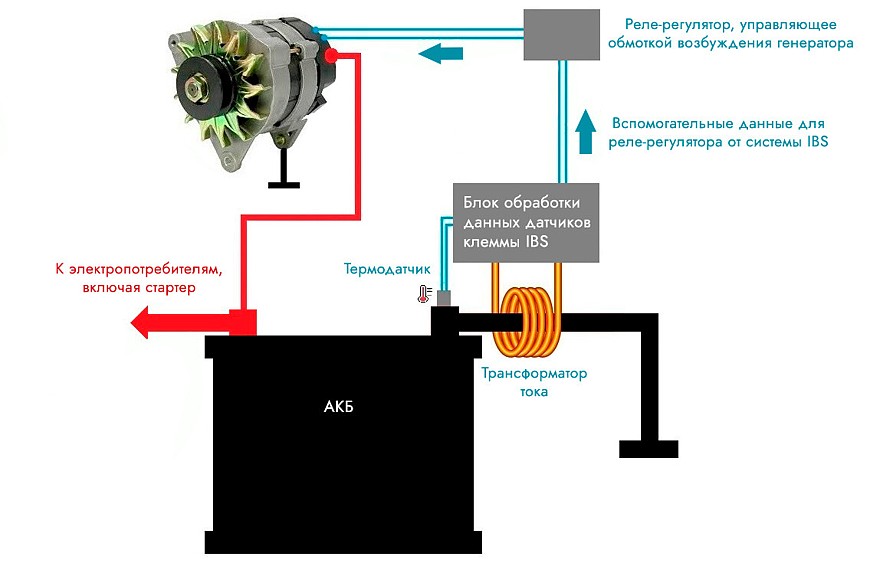 Коммутацию цепи батареи (ее отключение) система IBS ни при каких условиях не осуществляет – ни мощного реле, ни полупроводникового коммутатора в «умной клемме» нет. Она, ориентируясь на силу тока, его направление и температуру батареи, лишь непрерывно управляет обмоткой возбуждения генератора, изменяя напряжение в бортсети и отдаваемый генератором ток.