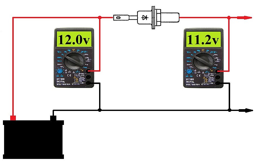 Частично эту проблему решали малой кровью с помощью простого диода, который включали в разрыв провода, идущего на реле-регулятор. Любой кремниевый диод характерен падением напряжения на нем на 0,7-0,8 вольта. Если мы измеряем напряжение на батарее непосредственно на клеммах, и получим, предположим, 12 вольт, то измерение той же батареи, но уже через диод, покажет 12-0,8=11,2 вольта. Этот эффект позволял обманывать реле-регулятор, подавая на него контрольное напряжение через диод. Реле-регулятор управляет напряжением в бортсети по принципу обратной связи, отталкиваясь от измеренного им же напряжения — увеличивая его, когда оно меньше нормы, и уменьшая — когда наоборот. А когда мы подаем на измерительный контакт напряжение через диод, то регулятор считает, что оно ниже реального на 0,8 вольта, и, соответственно, на ту же величину его поднимает.