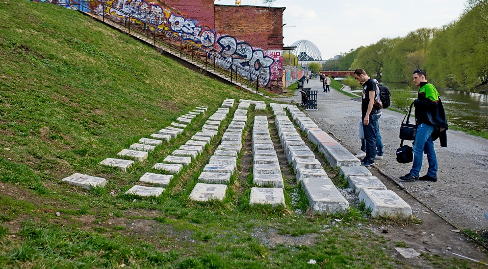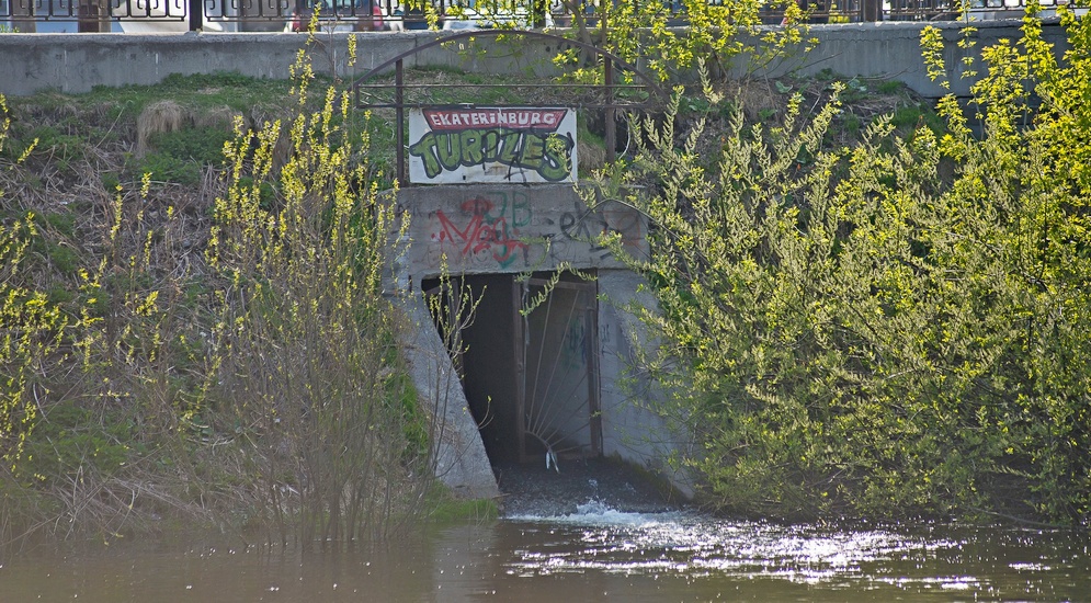 Уютные лавочки, как будто из давно ушедшей эпохи, сочетаются с современными арт-объектами: вон там виднеется вход в убежище черепашек-ниндзя (на почерневших от времени кирпичах – известный всем логотип), а там – памятник клавиатуре. Полузаброшенный дом рядом с ним молодёжь теперь называет не иначе как «системник», а речку – на английский манер, i-сеть…