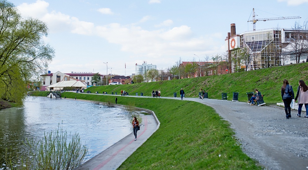 Пешая прогулка обещает немало приятного, особенно если повезло с погодой. Будем надеяться, вам повезёт, потому что погода в этом городе – это русская рулетка, и во все патроны заряжены тучи, ветер, осадки и… немного красивого уральского солнца. Под его лучами центр Екатеринбурга прекрасен. Пройдитесь по 8 марта, сверните на Малышева. Перебравшись реку Исеть по мосту, сверните ещё раз – к небольшой набережной на Плотинке: здесь Исеть, бурля, соскальзывает вниз через небольшой порог.