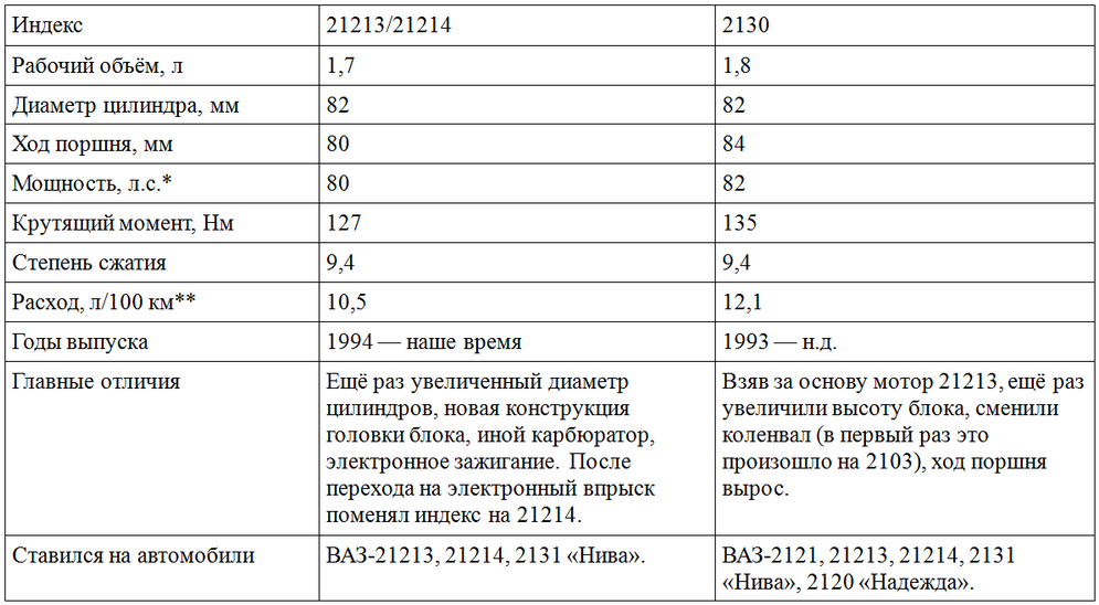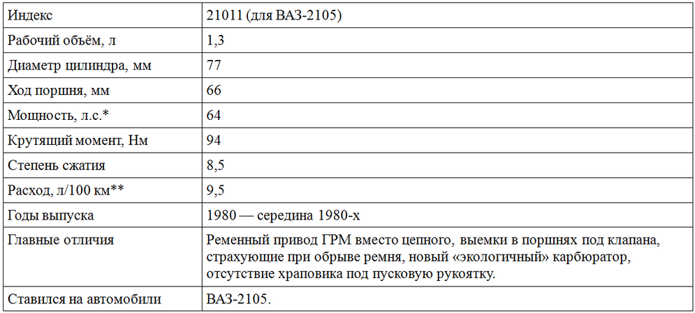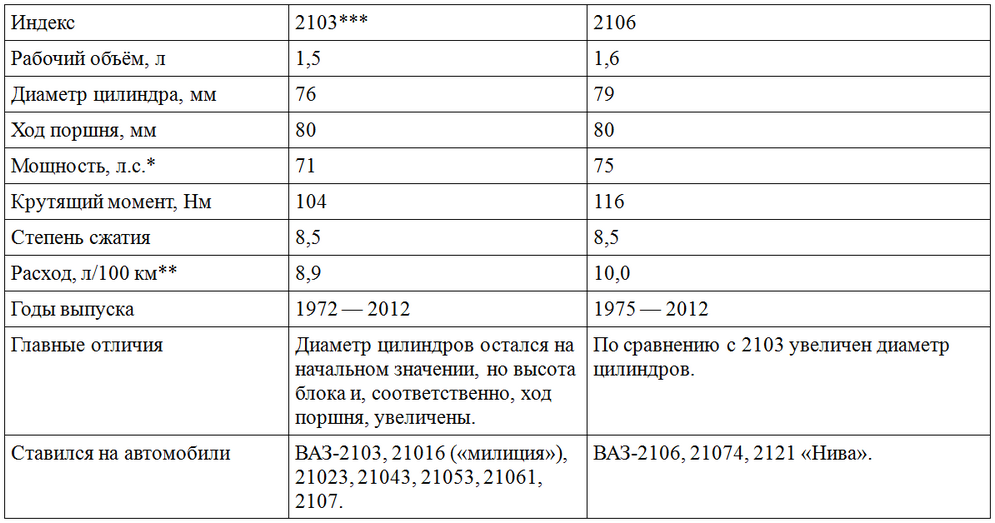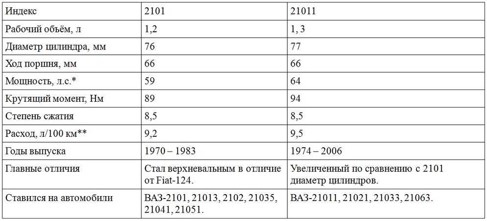 *Мощность, указанная в таблице, измерена по методу "брутто", то есть когда на двигатель, установленный на стенде, "навешаны" все вспомогательные агрегаты — генератор, водяной насос, глушитель, вентилятор. Помимо этого метода, ранее использовался метод "нетто" — замер мощности производится без вспомогательных агрегатов и измеренное таким образом значение может отличаться от "брутто" на 10-20%. Поэтому иногда имеет место расхождение, например, мощность мотора ВАЗ-2101 в некоторых источниках равняется 59 л.с., а в других 64 л.с., двигателя ВАЗ-2103 — 71 и 77 л.с. Более корректным (более реальным) следует считать первое из этих значений ("брутто"), именно такое и указано в таблице, второе же измерено по методу "нетто", по старому ГОСТу (в таблице не указано).