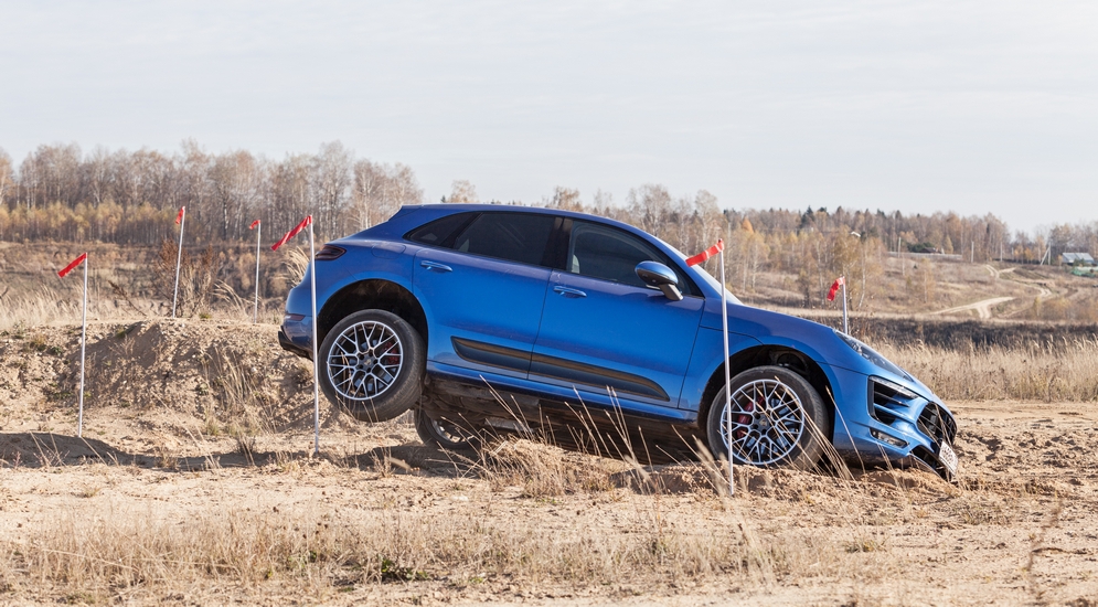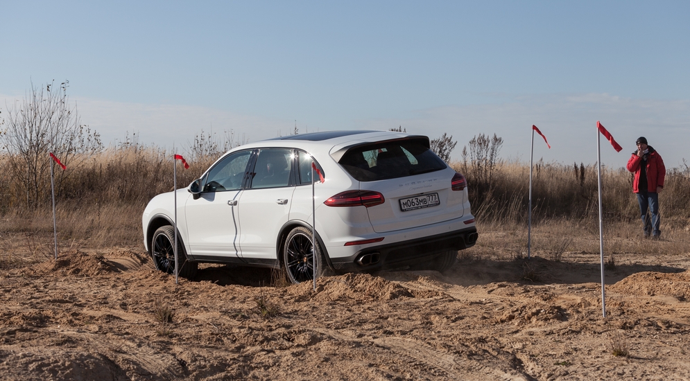 Cayenne и Macan не зря называют внедорожниками, поэтому первая часть дня прошла в песках и в воде. Что, смеетесь? А зря. Мы вывешивали колеса, проверяли углы поперечного и продольного уклона, в общем, выставляли машины в самые неприглядные позы. Macan, за который я сел, без проблем проходил все упражнения, разве что постоянно чиркал днищем в отличие от высокого собрата – Cayenne. Не по себе было разве что при испытании ассистента спуска с горы – машина-то ведь на городской резине, а уклон – нечеловеческий.