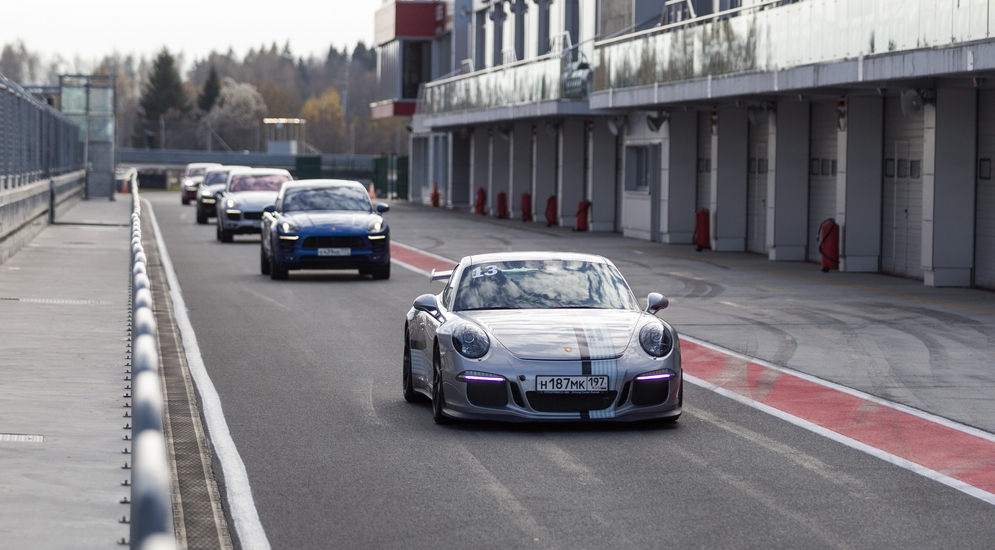 И теперь долгожданное. На старт выезжает колонна из шести машин с инструкторской 911 GT3 во главе колонны, за которым скромно пристроился я на Macan Turbo. Впереди два круга по трассе Moscow Raceway!