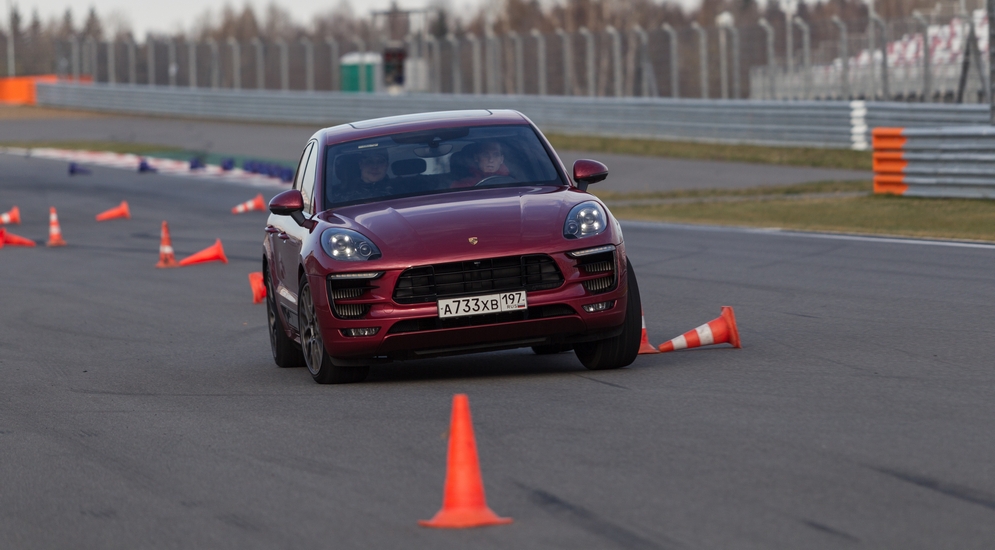 Настала очередь сесть за руль Cayenne GTS – самый «понятный» из всех Cayenne. Атмосферный двигатель радует ровной тягой во всём диапазоне оборотов. Здесь все те же электронные системы, что на Macan, но управлять этим «кабаном» гораздо тяжелее – несколько раз электроника и дельные советы инструктора меня буквально спасали от вылета.