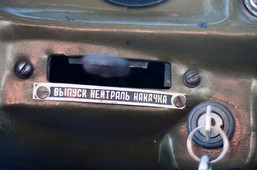 Первое, на что обращаем внимание, – это количество информационных табличек и кратких инструкций. Сделано это для того, чтобы восемнадцатилетний воин, попавший сюда по призыву, не сошёл сразу с ума и не угробил себя и единицу техники. Интересно, что все они обращаются к водителю на «ты», тогда как в руководстве по эксплуатации используются конструкции типа «водитель должен», «для этого необходимо» или просто «следует». Видимо, авторы вполне справедливо рассудили, что таблички будет читать обычный солдат, а руководство – офицер. А может, просто экономили место на табличках: «включи» или «закрой» пишется короче, чем «включите» или «закройте».