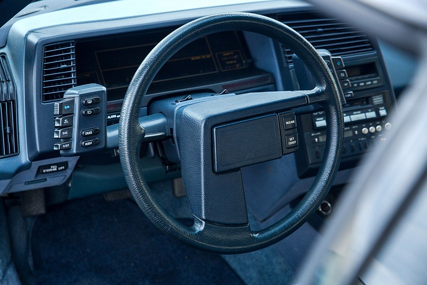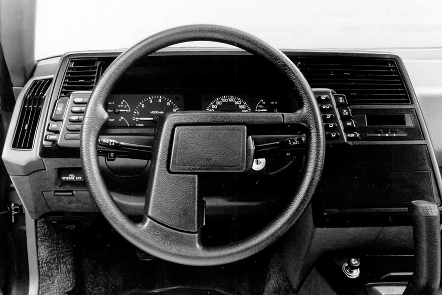 Ковшеобразные передние кресла они разместили максимально низко, а рулевое колесо регулировалось по вылету и наклону вместе с панелью приборов. Сама «баранка» привлекала внимание парой Г-образных спиц разной ширины, размещенных на трех и шести часах условного циферблата. В сочетании с достаточно крупной асимметричной ступицей это смотрелось очень необычно, причем эффект усиливали две группы переключателей, вынесенных на консоли-приливы слева и справа от руля.