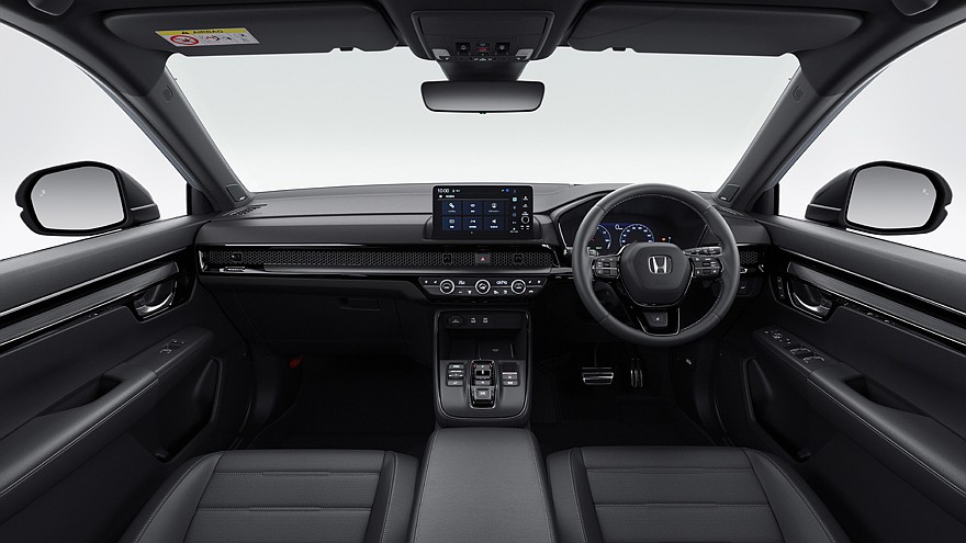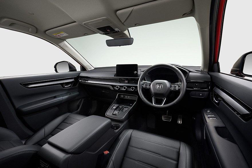 В салоне Honda CR-V e:HEV RS для Японии можно увидеть дисплей диагональю 10,2 дюйма, исполняющий роль виртуальной приборки. По центру передней панели располагается 9-дюймовый тачскрин информационно-развлекательной системы. Кроме того, в списке базового оснащения числятся: акустическая система Bose с 12 динамиками, подогрев сидений, устройство для беспроводной зарядки смартфонов и комплект водительских помощников Sensing ADAS.