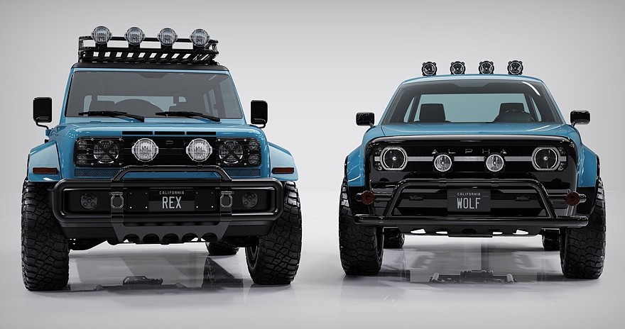 Мы называем Alpha Rex внедорожником условно, из-за его брутального дизайна, хотя базовые версии, как сообщает пресс-релиз, будут предлагаться с задним приводом и единственным электромотором. Платформа и техническая начина у Rex позаимствованы у пикапа Wolf, но кузов полностью оригинальный — это хорошо видно на картинке, где Rex и Wolf стоят рядом. Задняя часть кузова и крыша сделаны съёмными, чтобы можно было наслаждаться ездой под открытым небом. Съемные части могут быть изготовлены из разных материалов, линейка аксессуаров (багажники на крышу, дополнительная светотехника, кенгурятники и проч.) будет очень широкой.