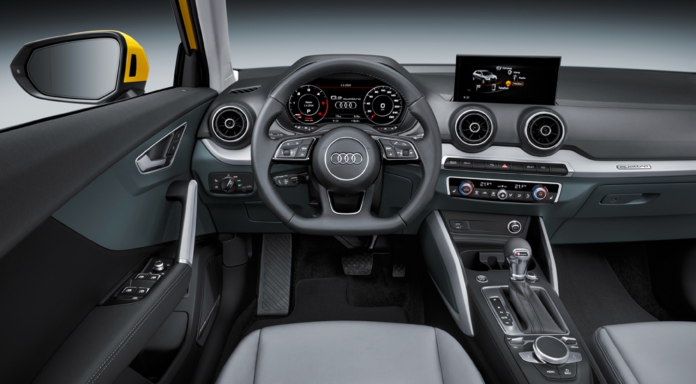 В списке оснащения Audi Q2, в зависимости от комплектации, значатся виртуальная приборная панель Audi virtual cockpit, проекционный дисплей, адаптивный круиз-контроль, ассистент движения в пробке, ассистент перестроения Audi side assist, система поддержания рядности движения, система распознавания дорожных знаков, парковочный автопилот и ассистент контроля поперечной устойчивости.