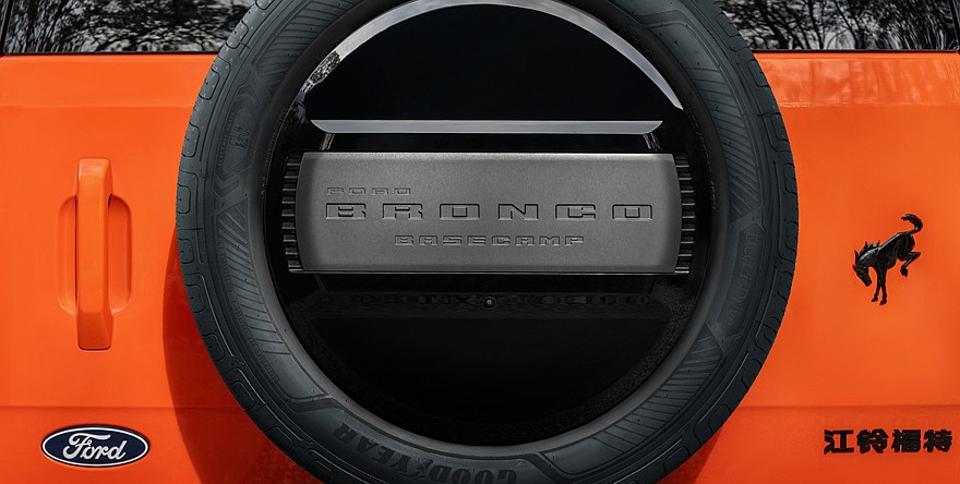Ещё Ford Bronco Basecamp достались обвес из некрашеного пластика по периметру кузова, расширенные накладки на колёсные арки, лидар, интегрированный в переднюю часть крыши чёрного цвета, выдвижные дверные ручки, спойлер со встроенным стоп-сигналом и «запаска» на багажной двери, по бокам от неё располагаются вертикальные фонари.