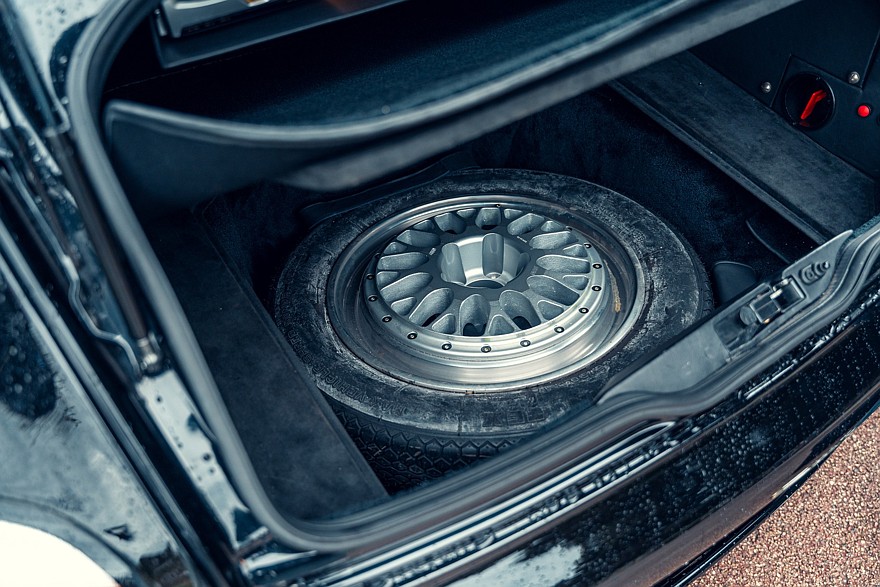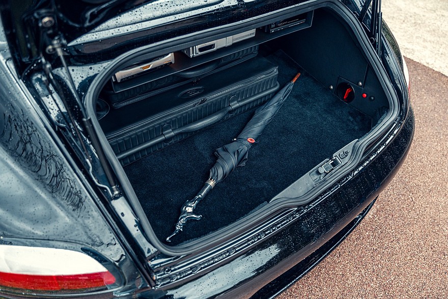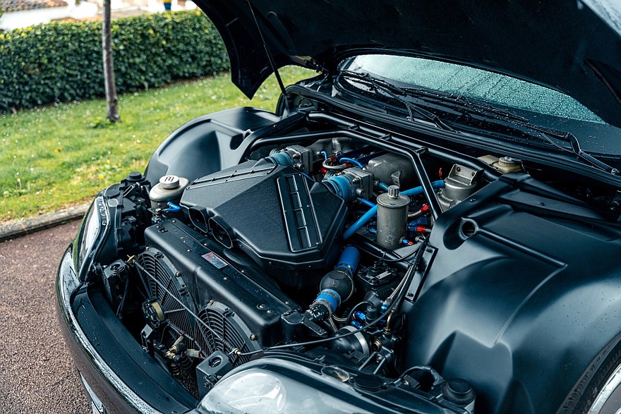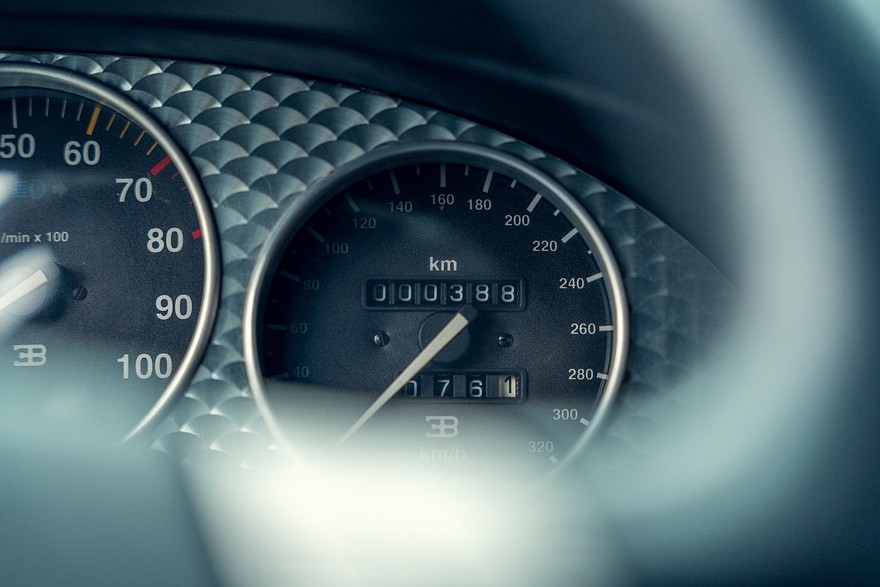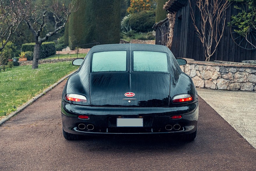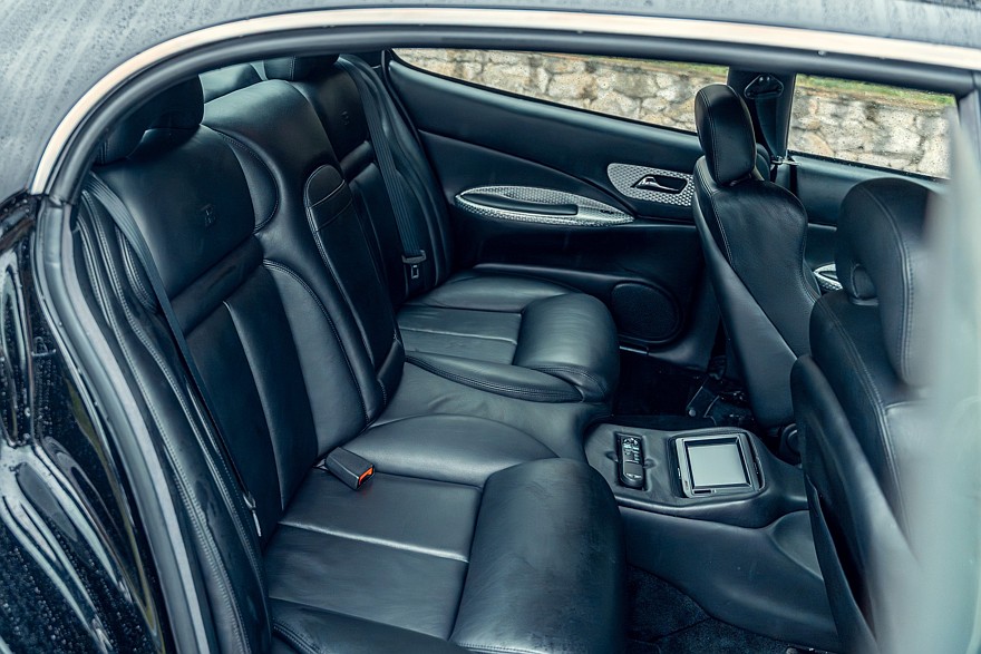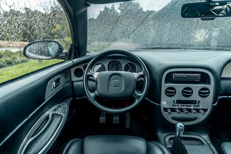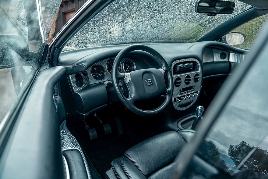 Четырёхместный салон проработан весьма тщательно для предсерийной машины и выглядит новым, потому что за прошедшие годы пробег составил всего 388 км. Приборы — исключительно аналоговые. На широкой центральной консоли можно разглядеть непропорционально мелкий кнопочный блок микроклимата, а в её верхнюю часть несколько неказисто встроена магнитола формата 1DIN. В багажнике на полке под крышкой установлено дополнительное музыкальное оборудование, в том числе бессмысленный по нынешним временам CD-чейнджер Alpine. В комплект входят два фирменных чемодана, набор инструментов и зонтик с рукояткой в виде скульптуры «Танцующего слона» авторства Рембрандта Бугатти — это брат Этторе Бугатти, основателя автомобильной компании Bugatti.