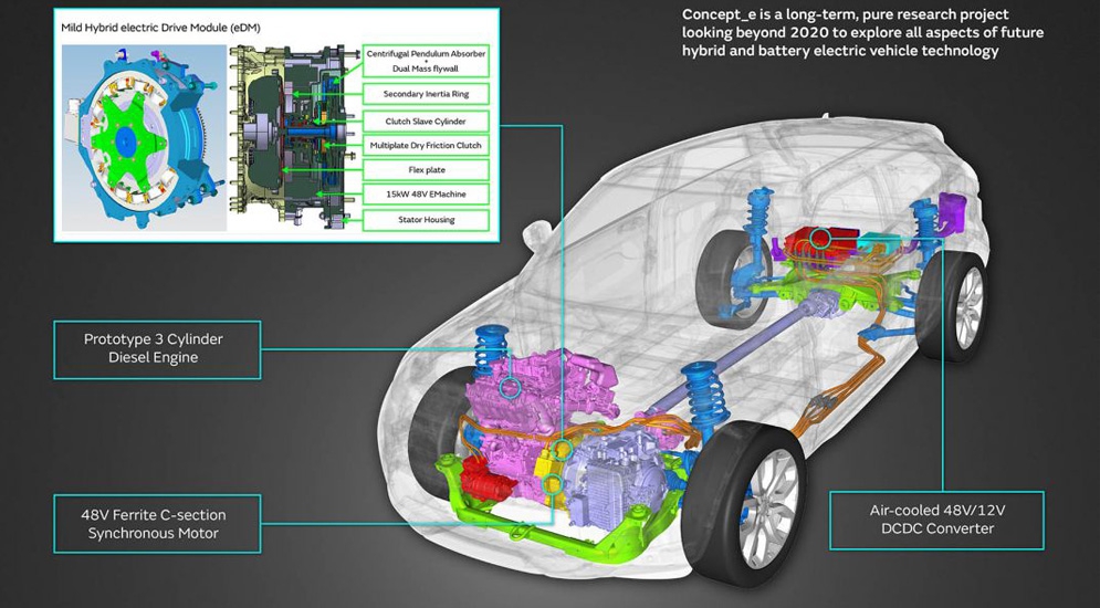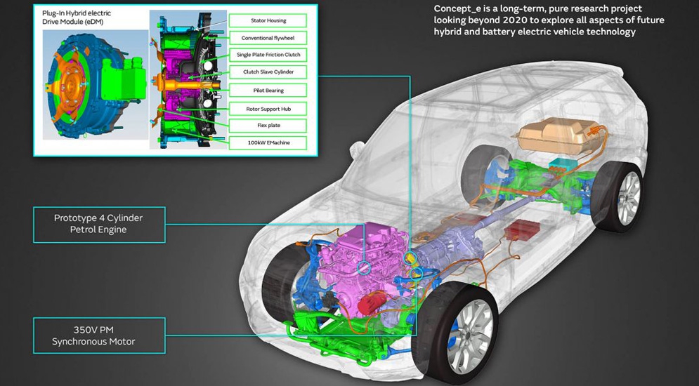 "Донорами" для исследования темы гибридов стали Range Rover Sport и компактный SUV Evoque. Гибридный прототип на основе "Эвока", получивший название e-MHEV, оснащается экспериментальным 89-сильным дизельным двигателем и 48-вольтным синхронным электромотором.
