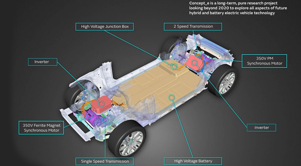 Третьим концептом является новая алюминиевая платформа, "заточенная" исключительно под электрическую тягу. Батарея ёмкостью 70 кВт/ч питает 115-сильный электромотор, вращающий передние колёса, и установленный сзади электродвигатель мощностью 197 "лошадок".