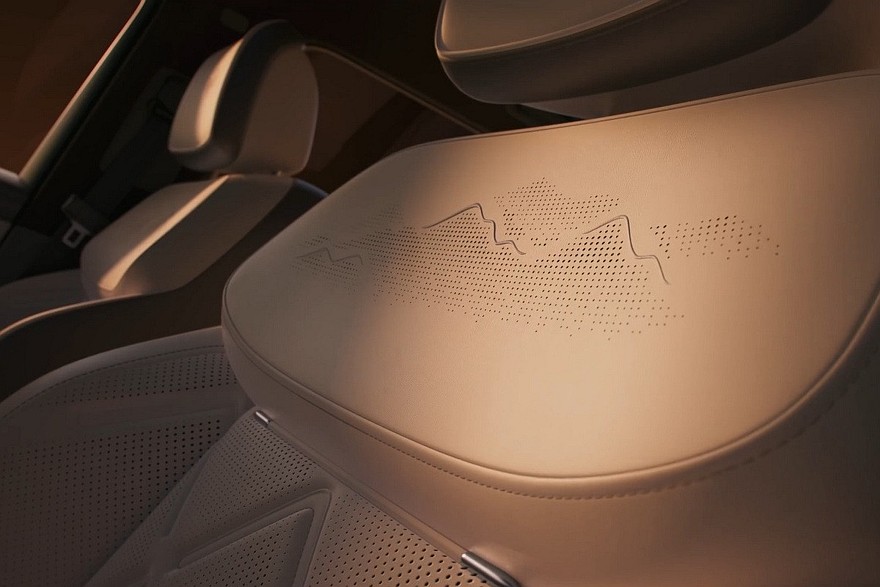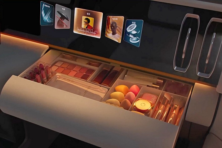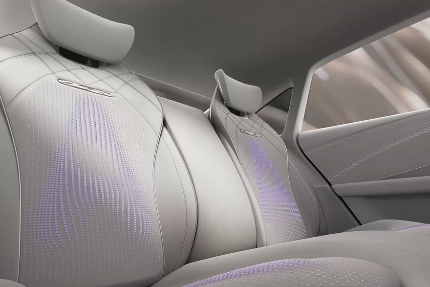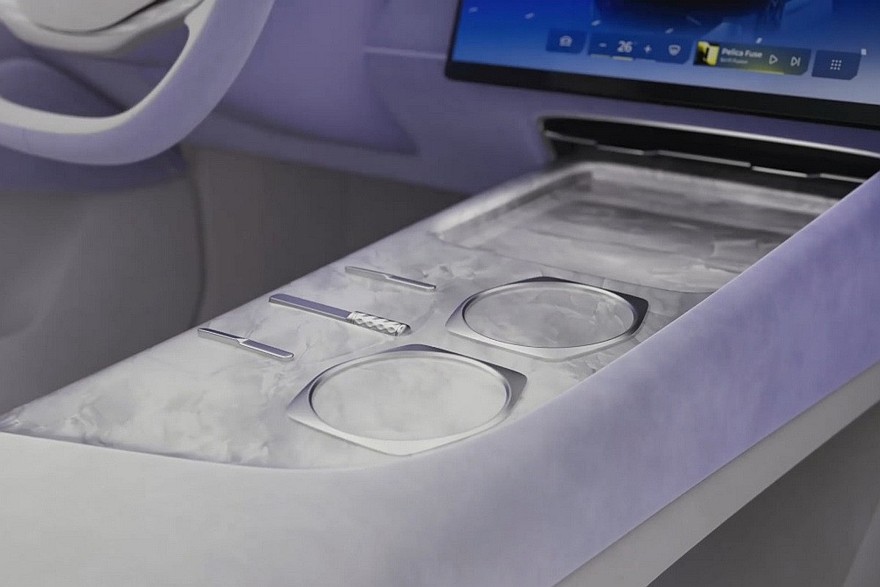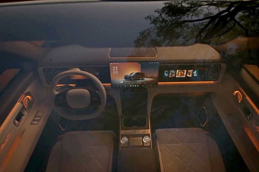 В шестиместном салоне – три экрана на передней панели и двухспицевый руль. Боковые дефлекторы обдува сделали вертикальными. На центральном тоннеле расположены беспроводная зарядка, пара неприкрытых подстаканников, физические клавиши и «хрустальные» шайбы. В торце тоннеля – сенсорная панель для основных настроек. У задних пассажиров есть свой, «потолочный», развлекательный дисплей. В спинки передних кресел встроены откидные столики.