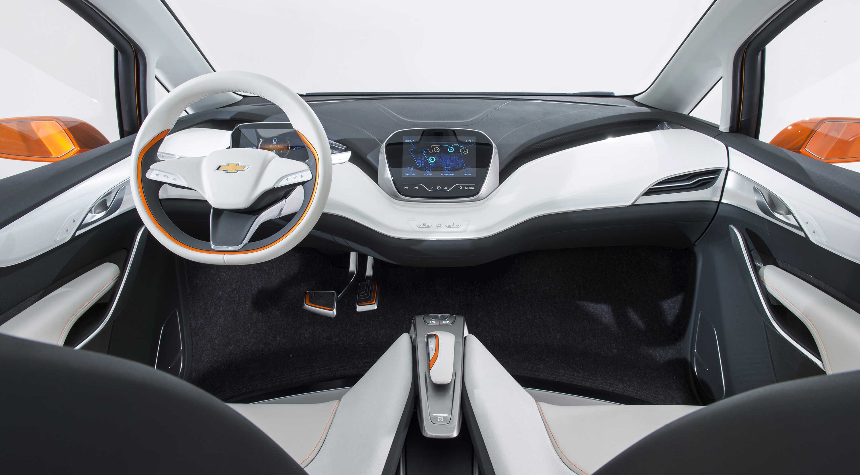 Интерьер концептуального Chevrolet Bolt должен отражать "воздушность" и создавать ощущение легкости. Видимо, поэтому всё выполнено в минималистичном стиле. Электромобиль получил 10-дюймовый сенсорный дисплей информационно-развлекательной системы, которая "дружит" со смартфоном. Смартфон можно использовать в качестве брелка, через специальное приложение можно припарковать Bolt автономно: автомобиль сам найдет место для парковки. Когда потребуется автомобиль, его можно будет вызвать и он подъедет к назначенному месту.