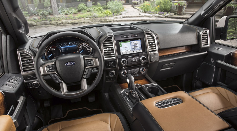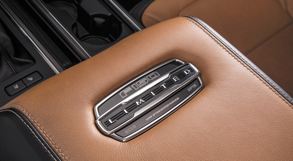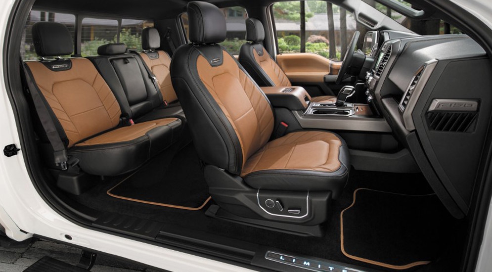 Определения "роскошный" вполне заслуживает и интерьер автомобиля. Сиденья пикапа отделаны кожей, на приборной панели красуются элементы декора из эвкалипта. Кожаную отделку, простроченную коричневой нитью, можно встретить и на верхней части приборной панели. Передние сиденья Ford F-150 Limited оснащены подогревом и массажёром. За развлечения отвечает мультимедийная система SYNC 3.