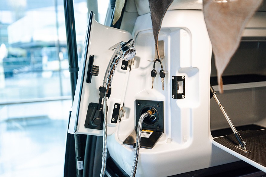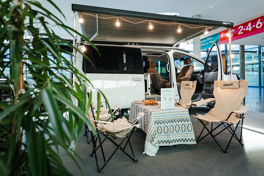 Ещё одна особенность концептуального кемпера – стекло с электронной регулировкой в задней части салона. Для повышения приватности, безопасности и общего комфорта во время путешествия или отдыха можно регулировать его прозрачность и степень затемнения, в этом помогает специальный сенсорный модуль в салоне. Это позволило значительно повысить защиту от ультрафиолета, улучшить тепло- и звукоизоляцию (по сравнению с обычным стеклом).