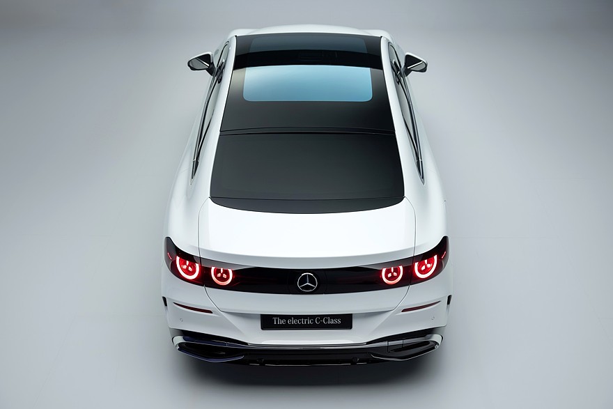Габаритная длина Mercedes-Benz C-Class electric — 4883 мм, ширина — 1892 мм, высота — 1503 мм, колёсная база — 2962 мм. Снаряженная масса — 2460 кг. В профиль C-Class electric — типичный фастбек, то есть седан без чётко выраженного третьего объёма. В задние стойки кузова вживлены окошки, из-за чего в профиль электрический C-Class напоминает не бензинового тёзку, а младший по рангу Mercedes-Benz CLA третьего поколения. Коэффициент аэродинамического сопротивления cx у C-Class electric составляет 0,22. Объём основного багажника — 470 л, спереди есть дополнительный багажник объёмом 101 л.