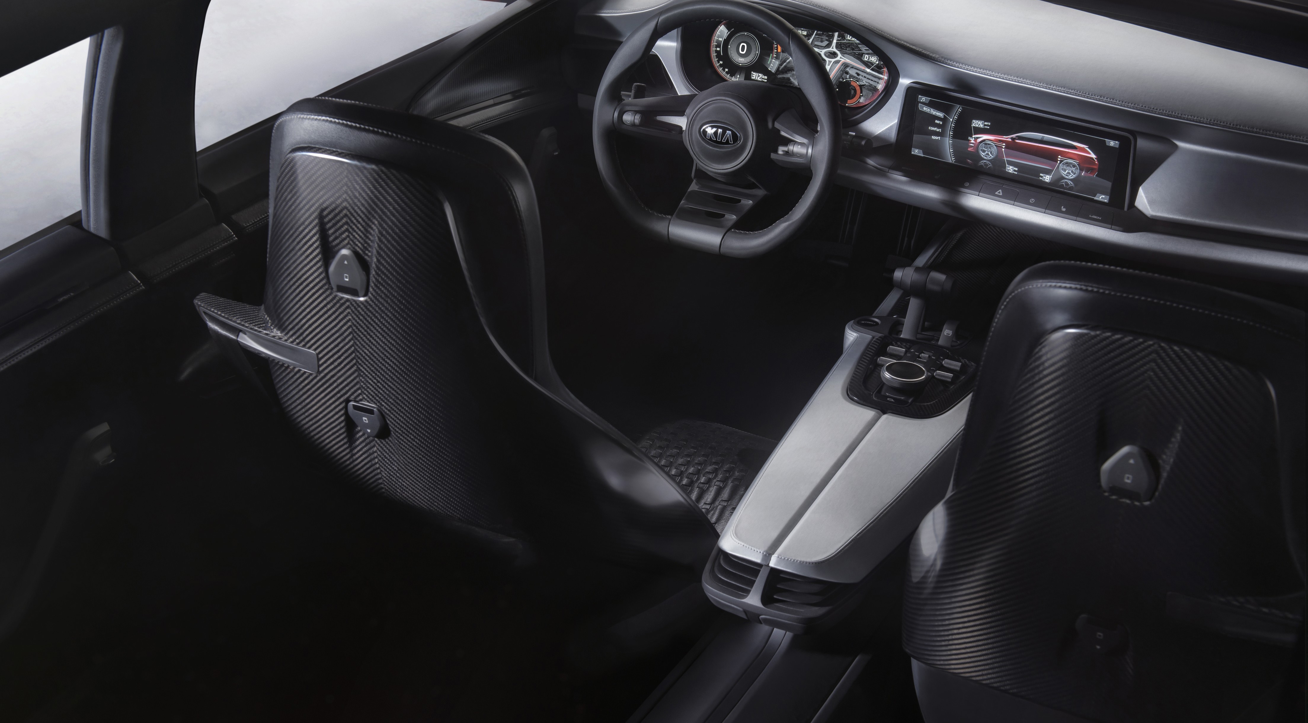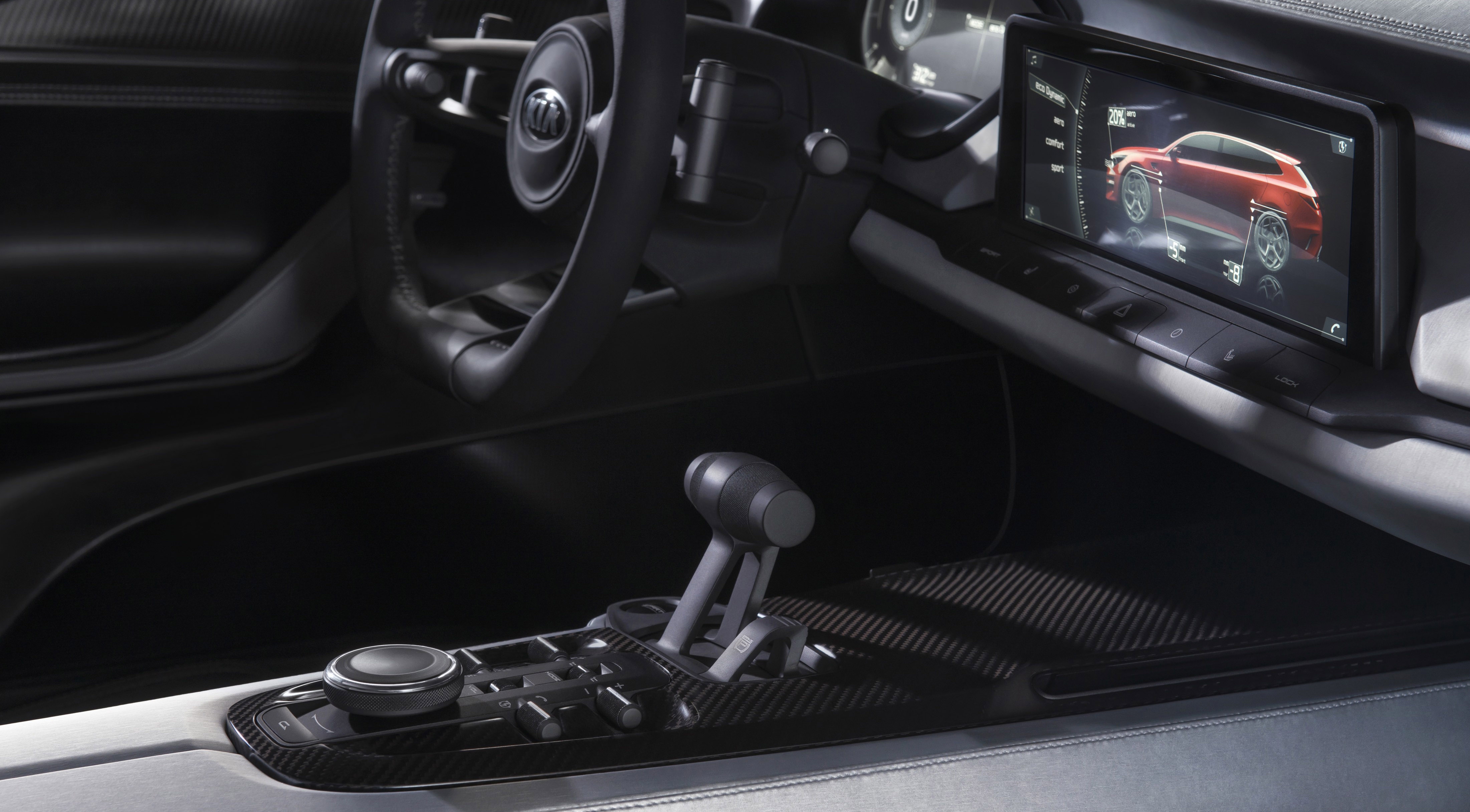 По замыслу дизайнеров, салон нового Kia Sportspace должен олицетворять простоту и давать максимум свободного пространства для каждого из четырех пассажиров. В отделке были применены алюминий, углепластиковое волокно и кожа. Еще одной идеей концепции интерьера Спортспейса была предельно выверенная эргономика. Автомобиль типа Gran Tourer предполагает спортивный характер, что означает буквально одно: во время управления водитель не должен отвлекаться ни на что и основные функции должны быть под рукой.