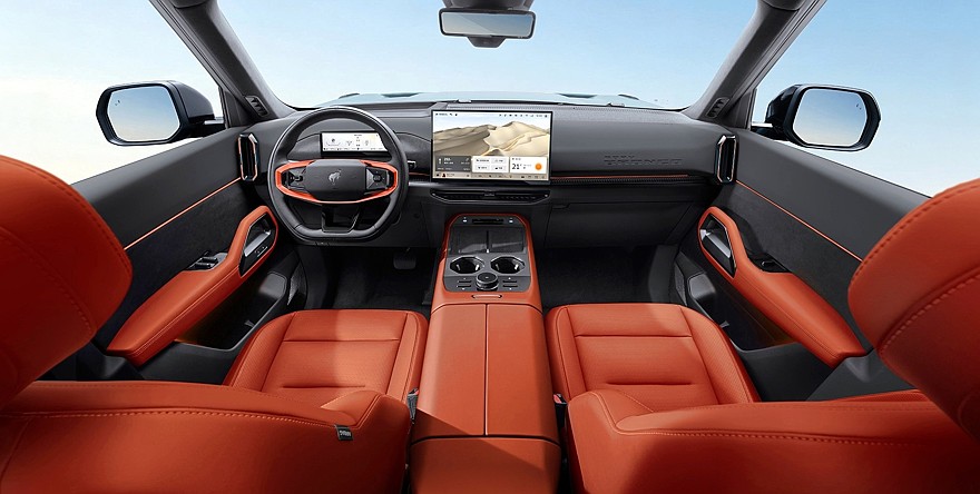 Передняя панель салона оформлена в типично китайском минималистичном стиле, физических кнопок на ней нет. По центру закреплён 15,6-дюймовый мультимедийный планшет с процессором Qualcomm Snapdragon 8255. Приборный экранчик — 8,8-дюймовый, во всех комплектациях, кроме базовой, он дополнен 70-дюймовым проекционным экраном на лобовом стекле. Топовая 1000-ваттная аудиосистема насчитывает 21 динамик. В передней части длинной консоли между передними креслами есть двойной лоток с 50-ваттной беспроводной зарядкой для смартфонов. Объём основного багажники — 497 л, у электрических версий спереди есть дополнительный багажник объёмом 160 л.