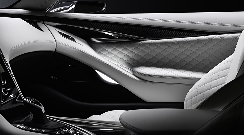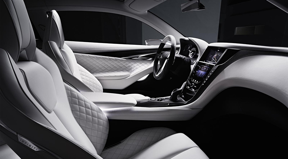 Одной из особенностей интерьера концептуального Infiniti Q60 являются "стильные ковшеобразные сиденья". Материалы отделки: кожа, карбон, полированный алюминий.