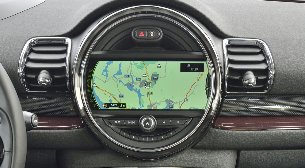 В салоне автомобиля традиционно для Mini доминирует оригинальная центральная консоль с круглым верхним сегментом. В базовой комплектации там располагается двухцветный информационный дисплей диагональю 2,7 дюйма. В более "продвинутых" вариантах оснащения на этом месте могут быть установлены цветные тачскрины диагональю 6,5 или 8,8 дюймов в зависимости от комплектации. В основании центральной консоли также появилась пара подстаканников и ячейка для мелочёвки.