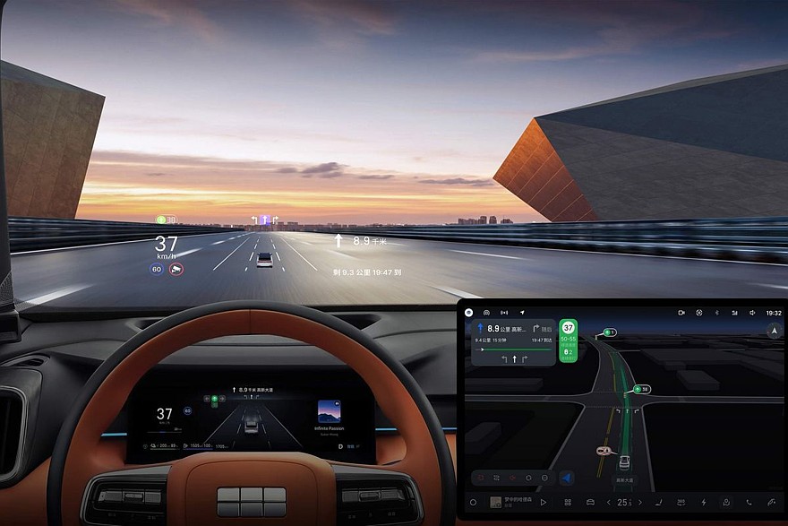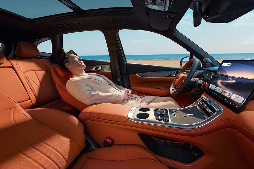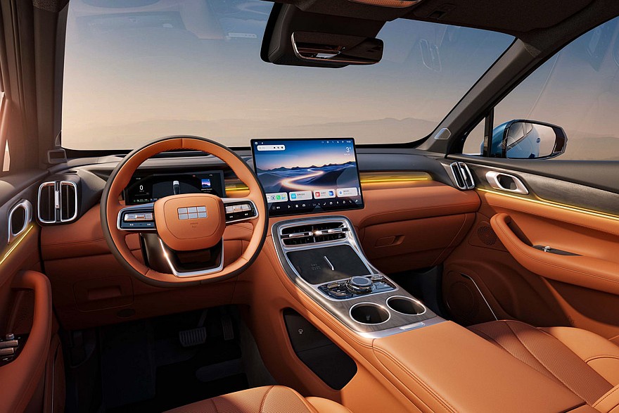 Внутри Geely Galaxy M7 подражает бензиновому Boyue L, хотя стопроцентного совпадения нет. Модели достались аналогичная передняя панель с вертикальными боковыми дефлекторами обдува, такие же карты дверей, раздельные экраны приборки (10,2 дюйма) и мультимедийной системы (15,4 дюйма). Но руль – свой, верхняя часть двухэтажного центрального тоннеля тоже скомпонована иначе. Мультимедиа работает на операционке Flyme Auto 2 на основе искусственного интеллекта. Объем багажника – 700 литров, со сложенными спинками второго ряда кресел – 1990 литров.