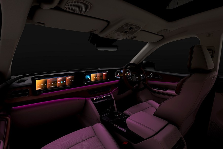 Внутри паркетник повторил стартовавший недавно электрокросс Mahindra XEV 9S, который хоть и заявлен в качестве отдельной модели, но, по сути, представляет собой «зеленую» версию как раз XUV700/XUV 7XO. Топливному автомобилю достались аналогичные передняя панель, руль и расположенная под центральными дефлекторами обдува сенсорная полоска. А еще Mahindra XUV 7XO уже в базе имеет трехэкранное табло без козырька – каждый дисплей диагональю 12,3 дюйма (у старого XUV700 табло состоит из двух экранов под козырьком). Мультимедиа – с поддержкой ChatGPT.