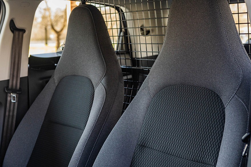Фургончик имеет только передний ряд, состоящий из двух сидений – для водителя и одного пассажира, место заднего дивана занято расширенным грузовым отделением с ровным полом и металлической сетчатой перегородкой, отделяющей пассажирскую часть от грузовой. На передней панели расположены два дисплея: 8-дюймовый исполняет роль виртуальной приборки, а у тачскрина информационно-развлекательной системы диагональ составляет 10,1 дюйма.