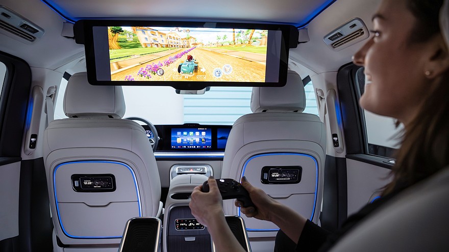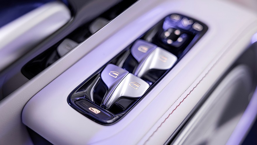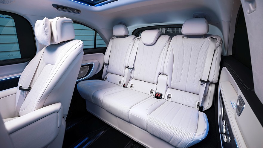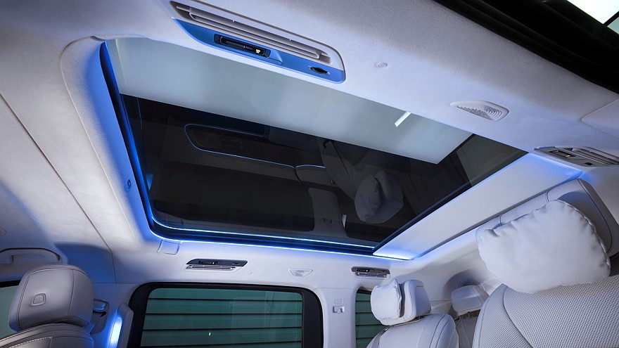 Передняя панель имеет типовое мерседесовское табло MBUX Superscreen, приборный экран здесь 10,25-дюймовый, центральный настроечно-мультимедийный — 14-дюймовый, а для переднего пассажира в виде опции доступен собственный развлекательный 14-дюймовый экран. Опция для водителя — проекционный 23,1-дюймовый экран. Между передними сиденьями может быть пустота либо высокий центральный тоннель. Для задних пассажиров предусмотрен 31,3-дюймовый развлекательный экран на потолке, на нём можно даже запускать видеоигры. Топовая аудиосистема Burmester насчитывает 22 громкоговорителя. Электронных ассистентов водителя будет много, но среди них не будет автопилота 3 уровня — Mercedes-Benz и BMW от него дружно отказались.