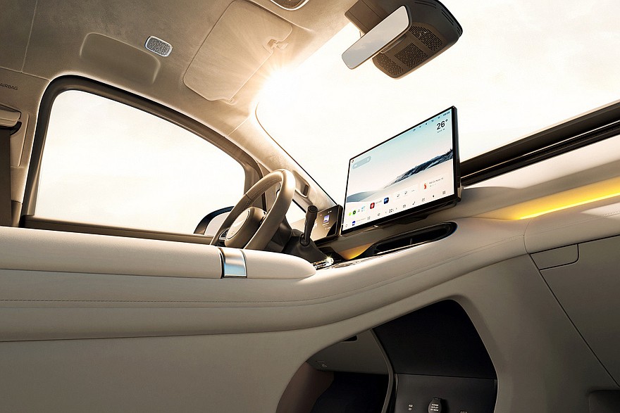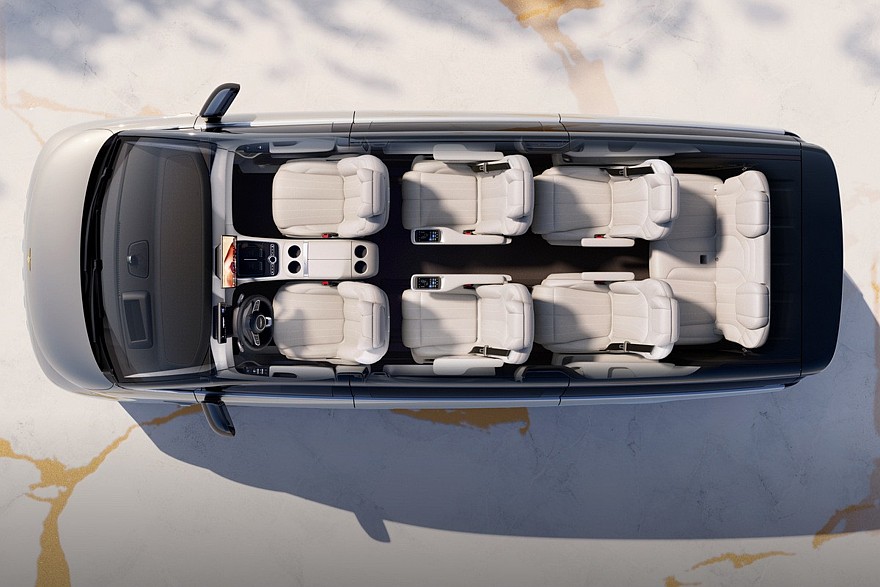 В салоне Galaxy V900 оставили раздельные приборку и планшет мультимедиа-системы. Передняя панель в принципе такая же, как у электровэна. При этом гибрид получил полноценный центральный тоннель, тогда как у Galaxy LEVC L380 – «парящая» консоль. Гибридный минивэн по умолчанию семиместный, за доплату он может быть шести- или восьмиместным.