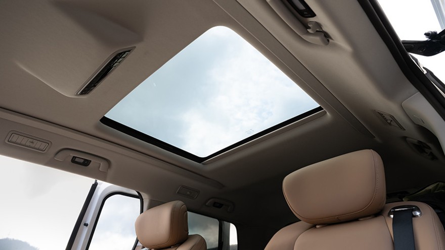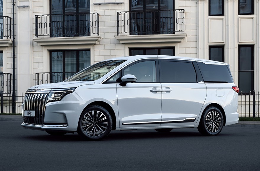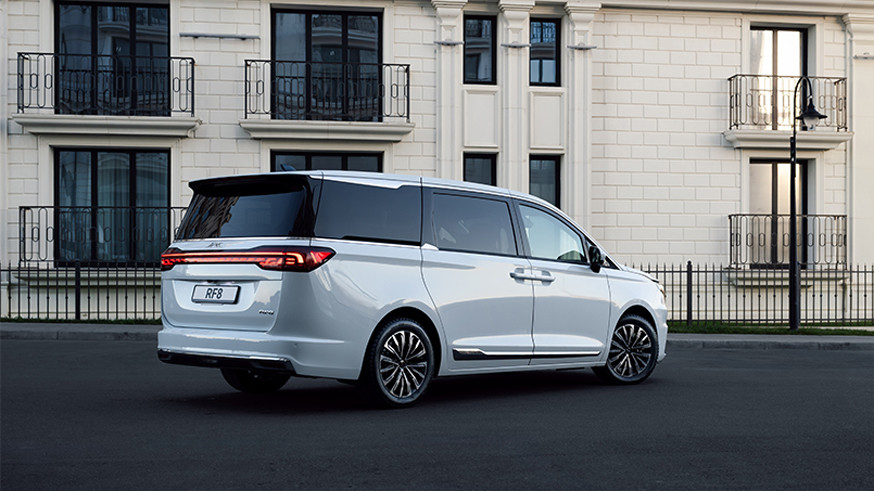 JAC RF8 получил: полностью светодиодную оптику, двухцветные алюминиевые колёсные диски, багажную дверь и раздвижные боковые двери с электроприводом и защитой от защемления, наружные зеркала с обогревом и функцией автоматического опускания при движении задним ходом, адаптивный ближний и дальний свет, функцию светового приветствия / прощания, панорамную крышу с люком и электроприводом.