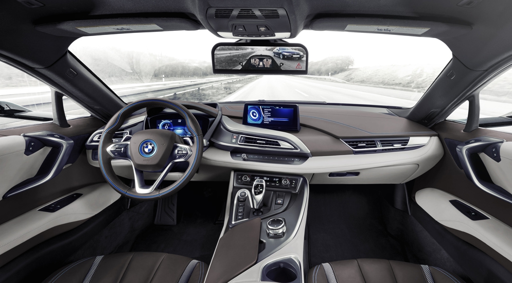У второго концепта – BMW i8 Mirrorless – вместо боковых зеркал установлены две видеокамеры, а третья камера интегрирована в экран с высоким разрешением, выполняющий роль салонного зеркала заднего вида. На этот дисплей и выводится изображение. В компании BMW считают, что камеры обеспечивают больший угол обзора, чем традиционные зеркала, и что автомобиль лучше справляется со «слепыми пятнами».