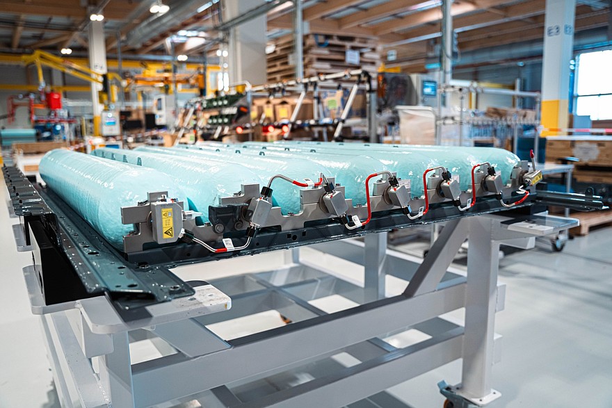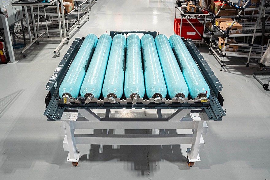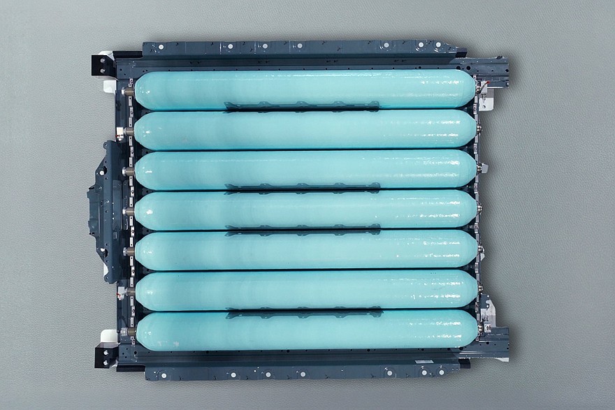 Новый BMW iX5 Hydrogen будет интегрирован в общую производственную цепочку кроссовера пятого поколения, то есть будет собираться на том же конвейере, что и другие версии X5, соответственно его конструкция оптимизирована под массовое производство. Так, система хранения водорода занимает физически то же место, что и тяговая батарея у электрических версий X5: семь углепластиковых баллонов для хранения водорода упакованы в общий плоский металлический корпус и находятся под полом кузов в пределах колёсной базы.