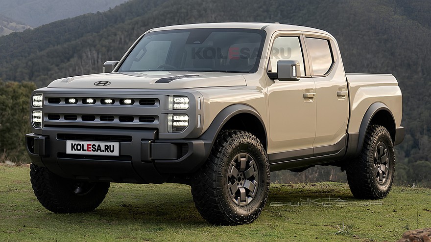 Вполне вероятно, гораздо более интересным для американского рынка станет совершенно другой пикап, разрабатываемый компанией Hyundai, который, в отличие от Santa Cruz, получит более привычную рамную конструкцию. Дизайн, если ориентироваться на свежий концепт Boulder, станет абсолютно иным: вертикальная передняя часть будет выполнена в своего рода ретро-стилистике, напоминающей старые американские пикапы. Пока неизвестно, насколько сильно серийный пикап будет отличаться от концепта, поэтому за основу для рендеров был взят пикап Kia Tasman, так как форма остекления и дизайн его боковин хорошо сочетаются со стилем концепта. Сзади появились фонари в стиле того же Boulder, похожий бампер, а на борту выштамповано название бренда.