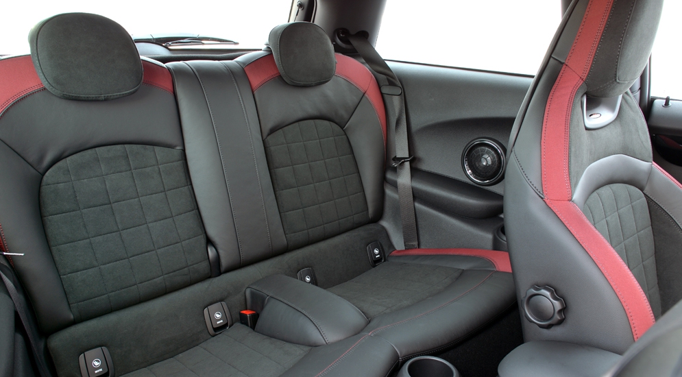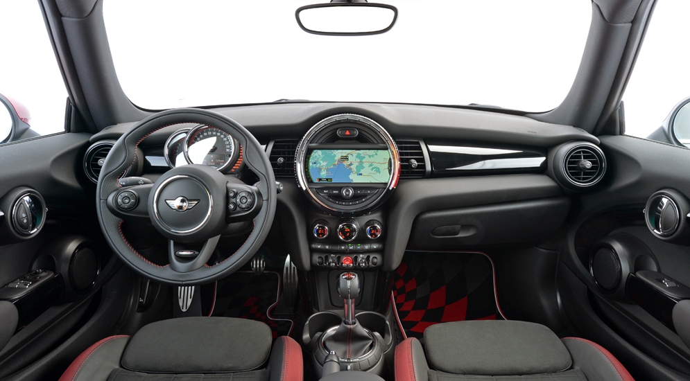 Интерьер отличают спортивные сиденья с комбинированной обивкой из кожи Dinamica и ткани с интегрированными подголовниками, а также мультифункциональное рулевое колесо John Cooper Works. Стоит отметить, что обивка потолка автомобиля имеет антрацитовый цвет, а рычаг переключения передач, педали и площадка для левой ноги водителя выполнены из нержавеющей стали.