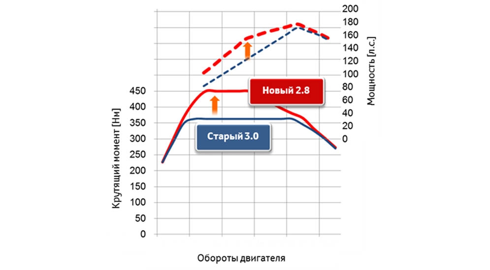 Что касается флагманского турбодизеля объёмом 2,8 литра, то он выдает 177 "лошадок" и 450 Нм. Добиться улучшения его рабочих характеристик удалось благодаря оптимизации конструкции, процесса сгорания топлива и усовершенствованной системе выпуска.