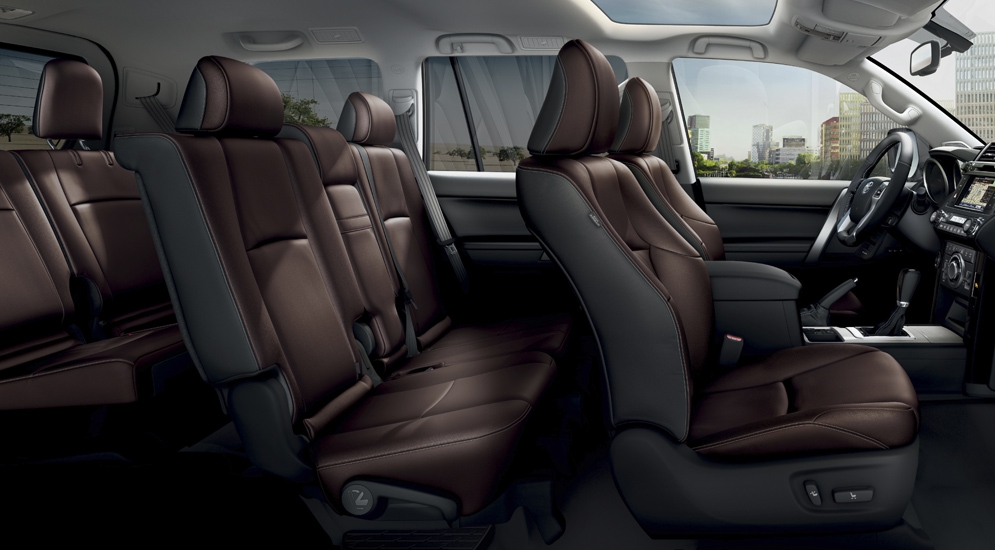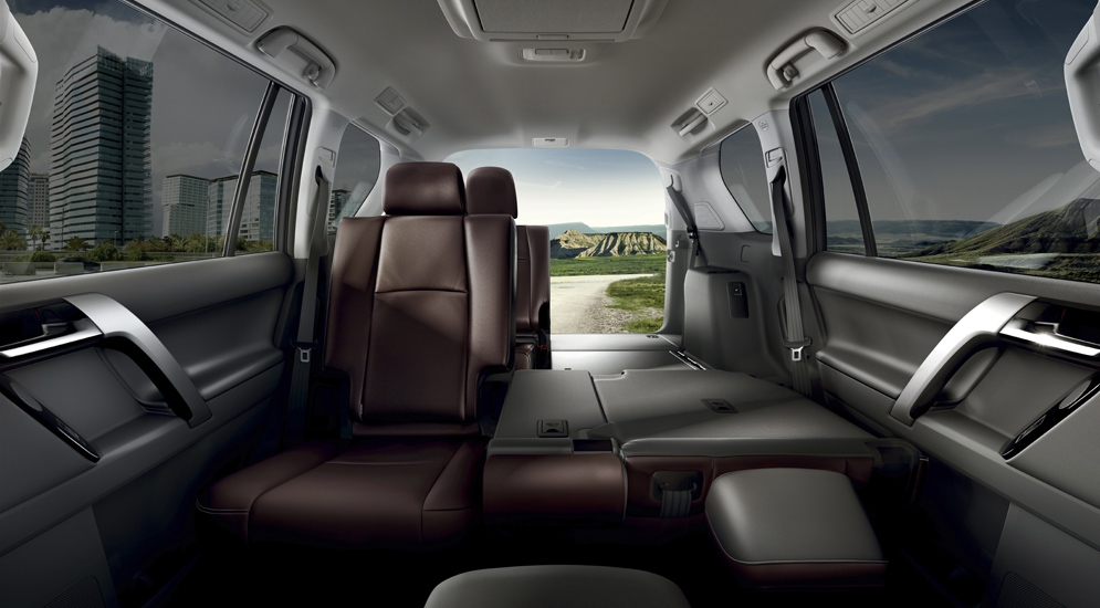 Интерьер обновлённого Prado может быть отделан кожей одного из трёх цветов. Сиденья второго ряда складываются в пропорции 60:40 и в некоторых комплектациях могут оснащаться подогревом. За информационную и развлекательную составляющие отвечает мультимедийная система Toyota Touch 2 with Go (в комплектации "Люкс" – с динамиками JBL) с цветным тачскрином на центральной консоли. Служебную информацию показывает дисплей диагональю 4,2 дюйма на приборной панели.
