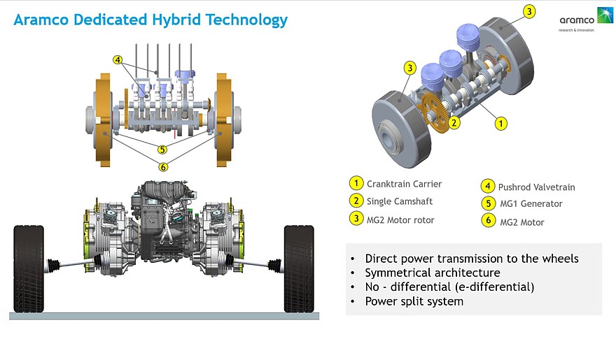 Силовая установка Aramco DHE разработана за рамками Horse Powertrain и предлагает новый взгляд на то, что такое максимально эффективный гибрид. В центре этого проекта находится ДВС, разработанный специально для работы в составе гибридной силовой установки. Опытный образец, показанный на иллюстрациях, представляет собой рядный трёхцилиндровый бензиновый двигатель с рабочим объёмом 1599 см3, диаметр цилиндра — 82 мм, ход поршня — 101 мм. Двигатель имеет нижневальную архитектуру и всего два клапана на цилиндр без фазовращателей, благодаря чему удалось максимально уменьшить его габариты. Для обеспечения необходимой мощности применены комбинированный впрыск топлива (в камеры сгорания и во впускной коллектор) и электронаддув. Для снижения потерь на трение вместо подшипников скольжения используются роликовые. Навесного оборудования нет, так как для работы вспомогательных систем используется электричество.