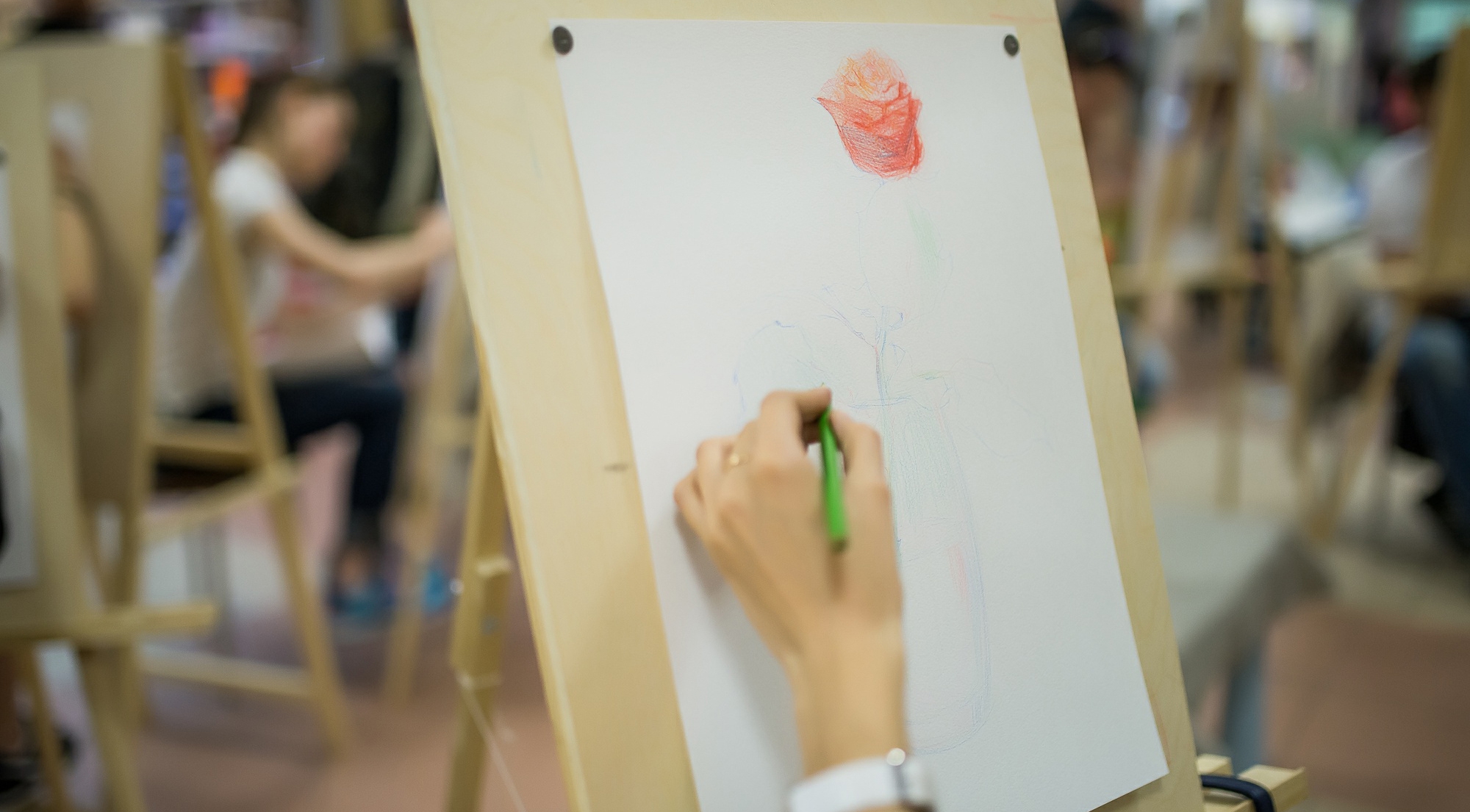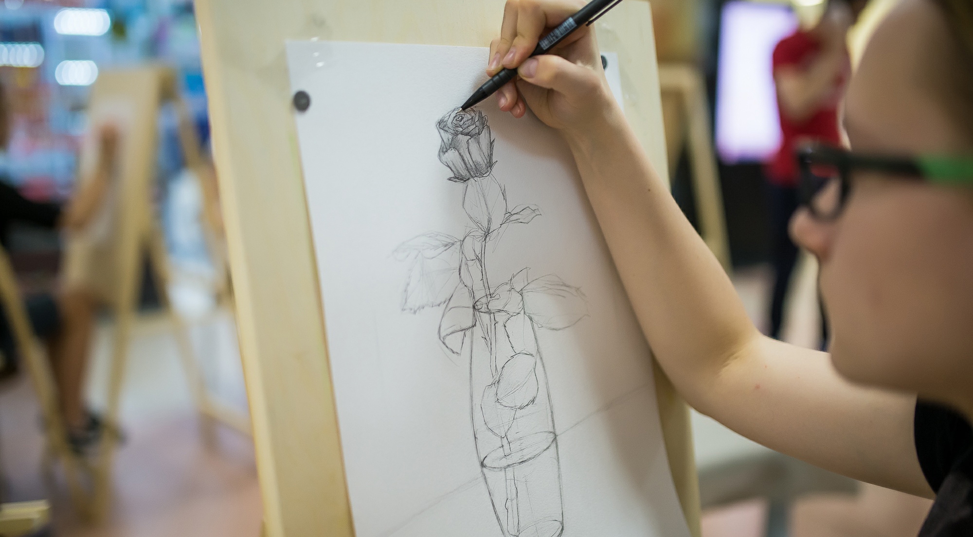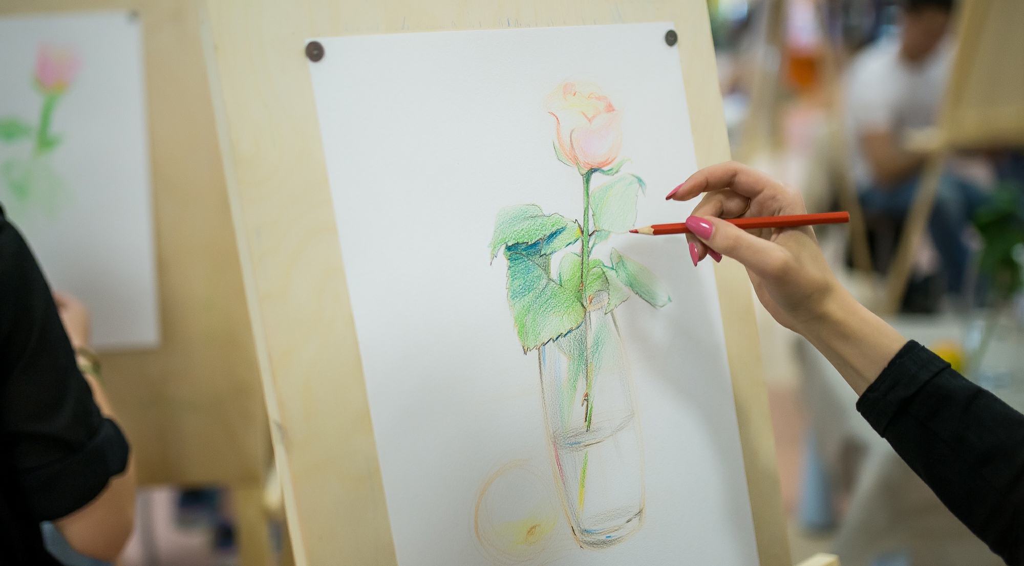 Пришедшим поучиться искусству у художника Евгения Уткина предлагалось нарисовать карандашами натюрморт — роза в вазе и лежащее рядом яблоко. Уровень выполненных работ получился небывало высоким — к нам пришли явно неслучайные люди. Ну а второй художник проекта, Армен Карапетьянц, пока коллега был занят учебным процессом, писал маслом натюрморт на тему Великой отечественной войны.