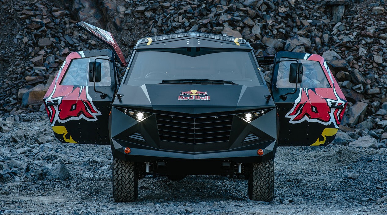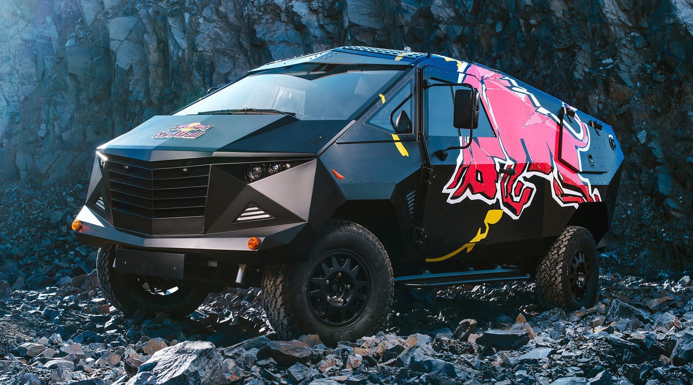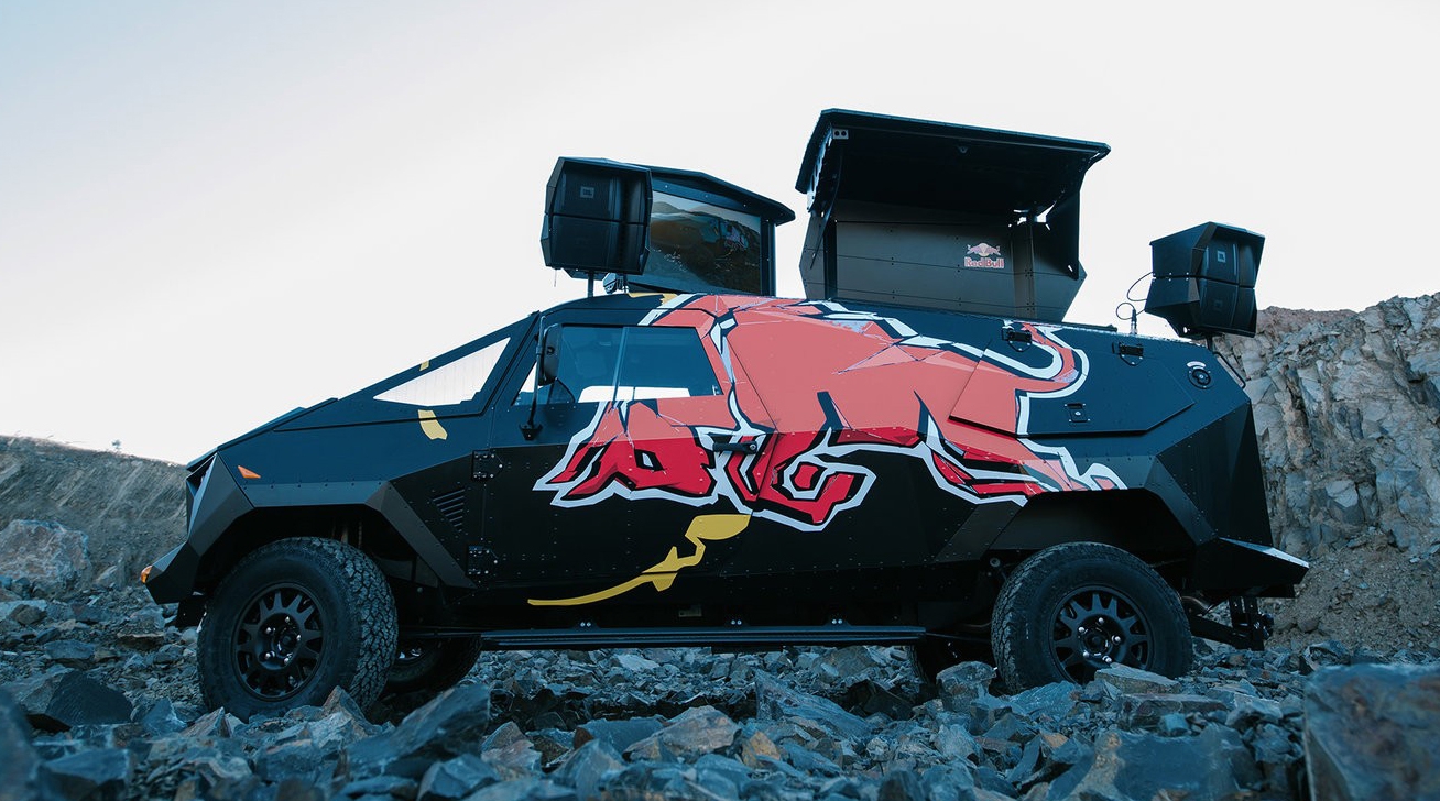 Постройкой полноприводного минивэна занялись коллеги Red Bull из Австралии. Все началось с шасси длиннобазного Defender 130, которое обросло кузовом, выполненным по принципу "чем больше граней, тем лучше". Во внутрь поместили оборудование для диджея, чтобы вечеринка могла начаться где угодно.